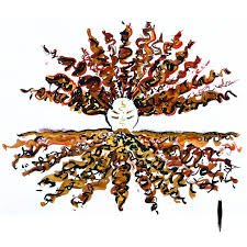 A stark Art Deco design of a white eyeball on a black background with a red iris and lighting bolts coming from it A radio antenna peers from the top with a red crescent across it