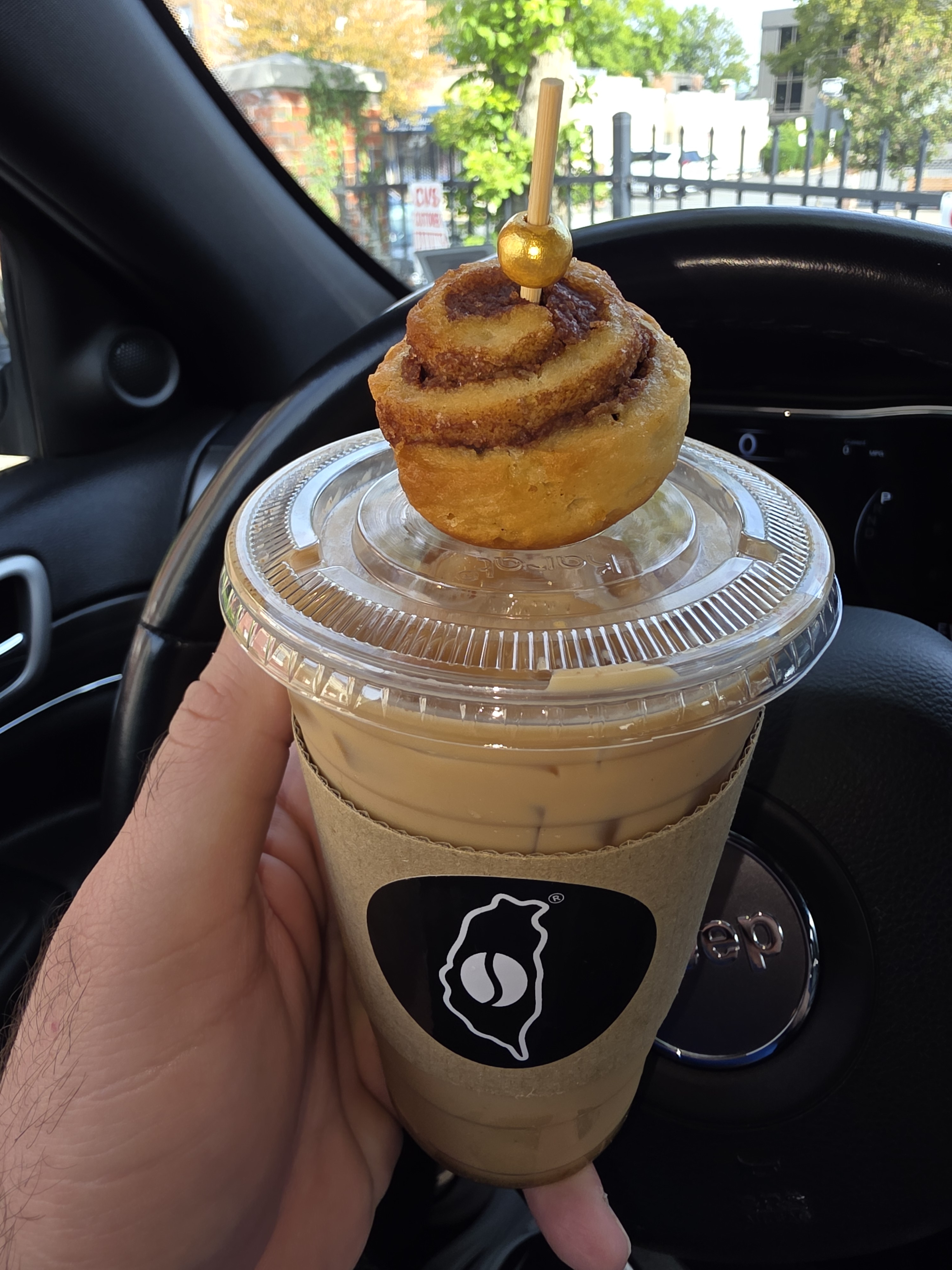 At home drip brewed iced coffee, no sugar but w/ a splash of dairy in it.