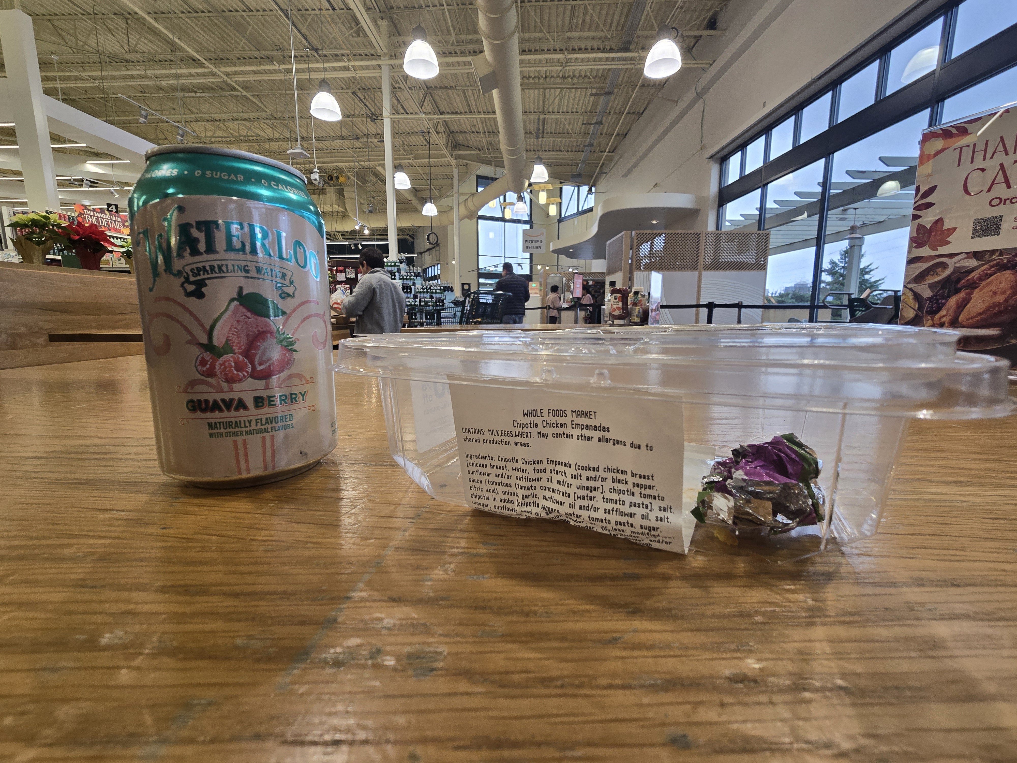 Just went to a whole foods in Bellevue, WA USA. and finished 2 deli empenadas and a can of Guava Berry Waterloo drink w/ a single peice of alter eco classic drk truf choc as treat.
