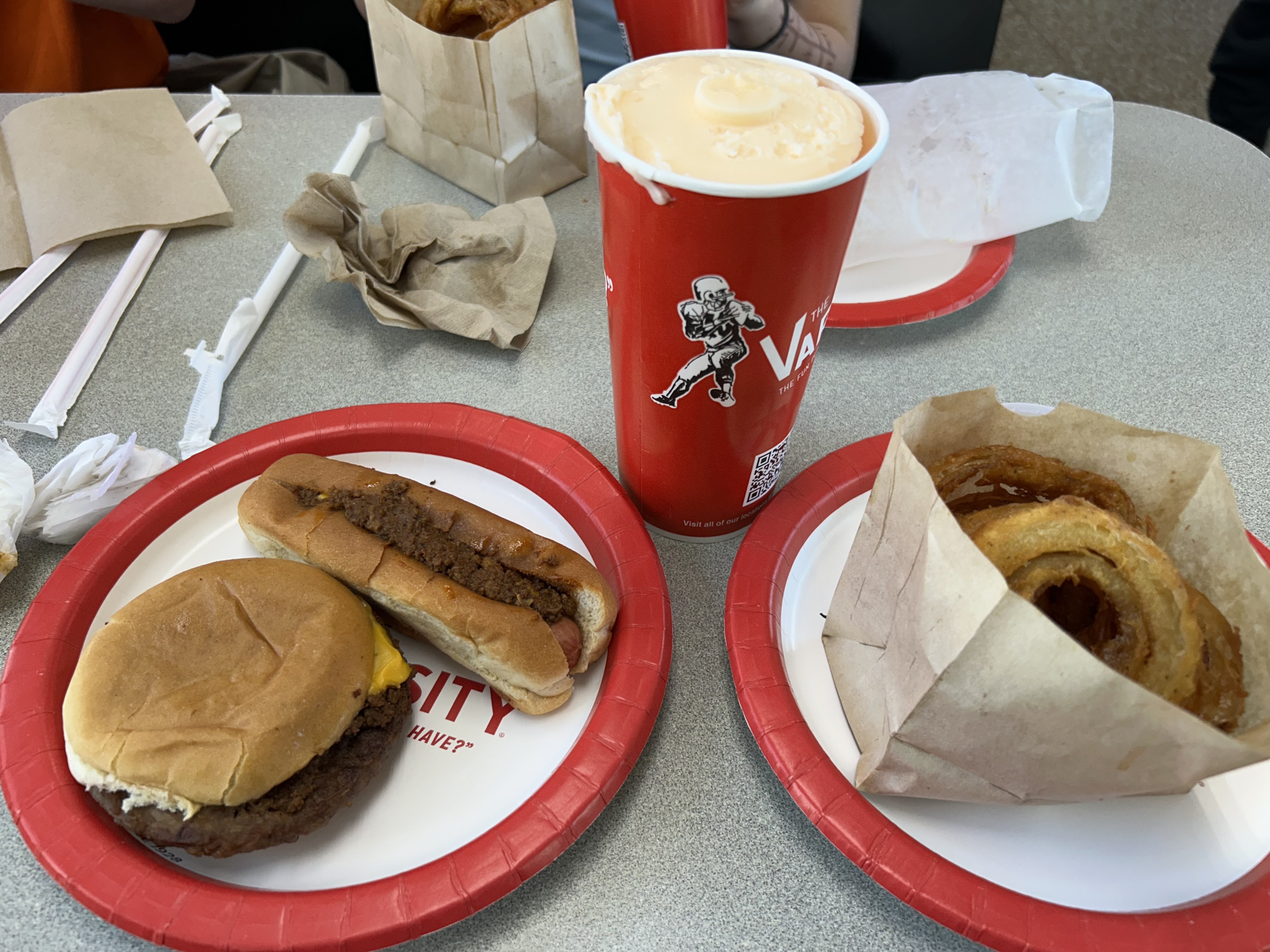 Stopped by the Varsity for chili cheese burger, chili cheese hot dog, onion rings, and the classic frosty orange.