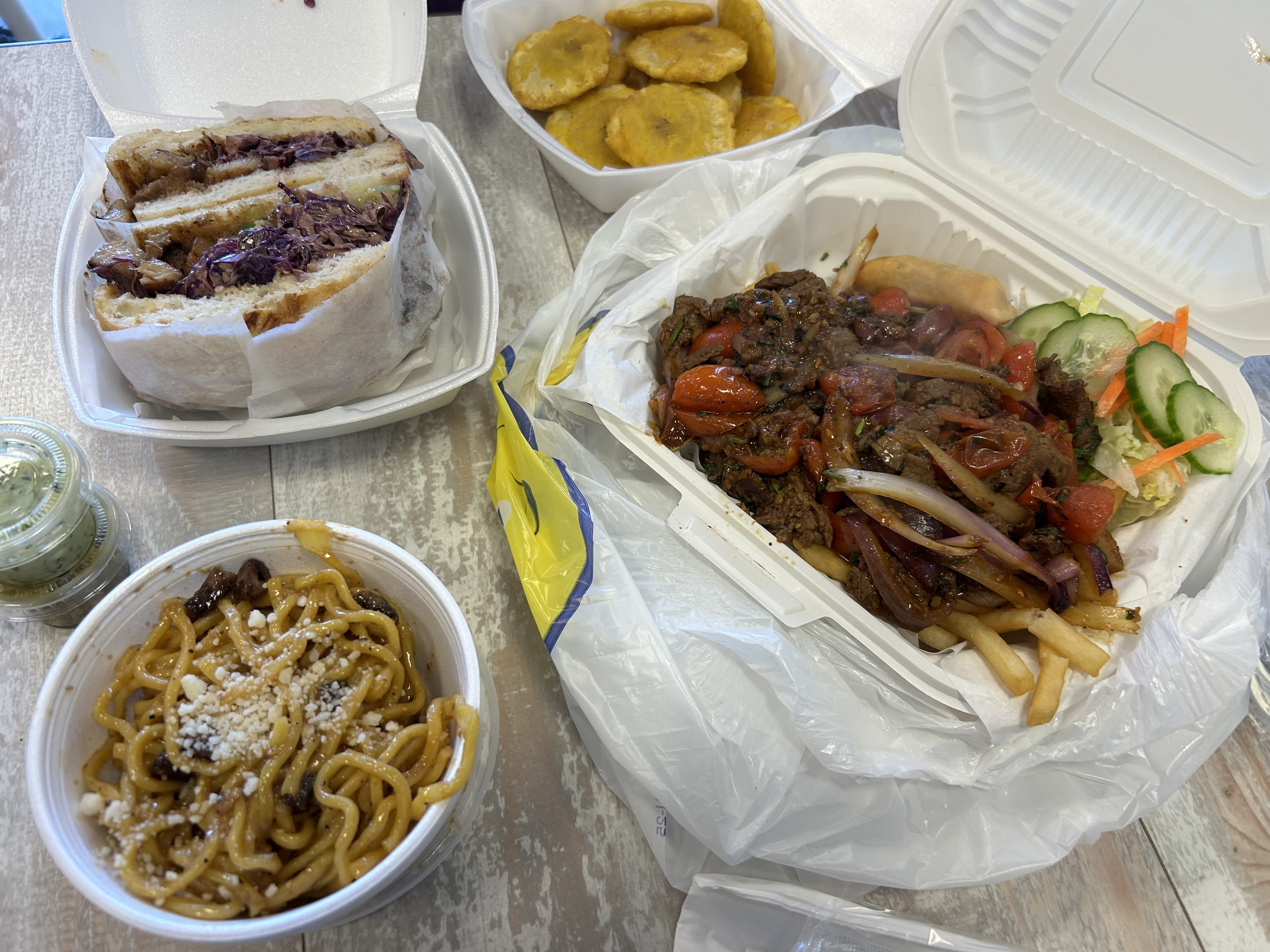 Some friends had stated lomo saltado was available but not on the menu, so we ordered that, with some garlic noodles, tostones, and a pork belly sandwich. Noodles were almost a little too garlicky, but everything else was amazing, especially the saltado. So good!