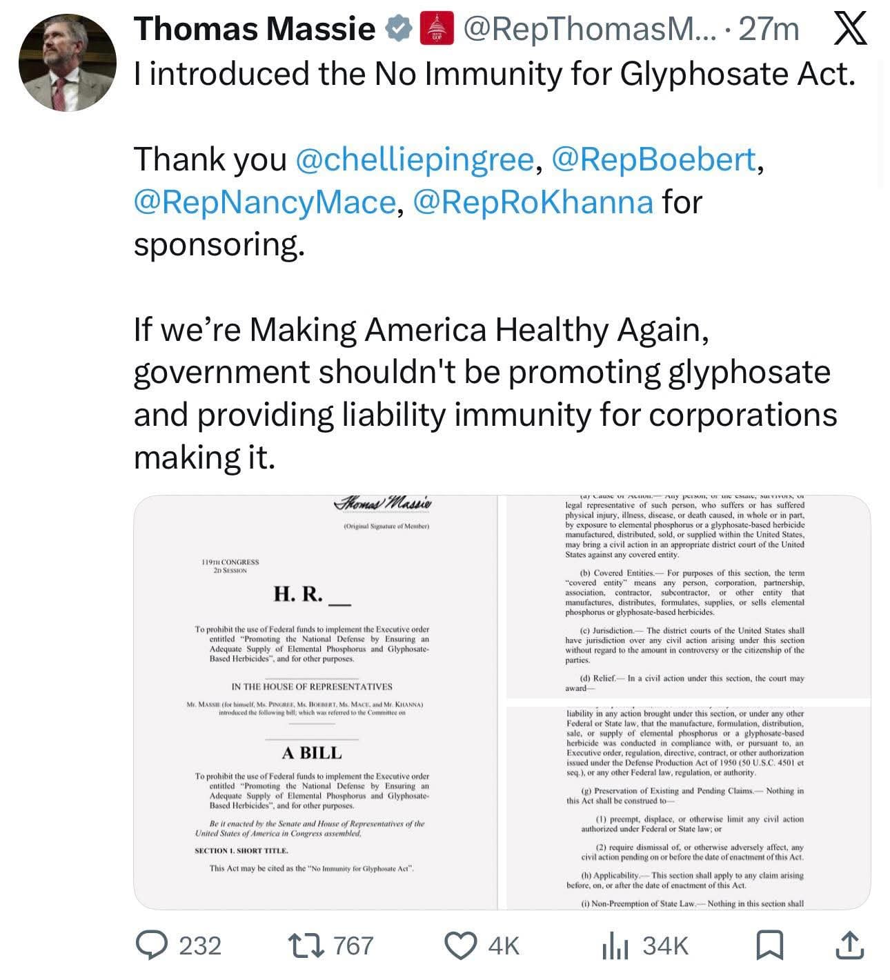 While state level Republican rusty grills tries to shield pesticide corporations from sick farmers— @RepThomasMassie moves to farmers at the federal level👇🏽