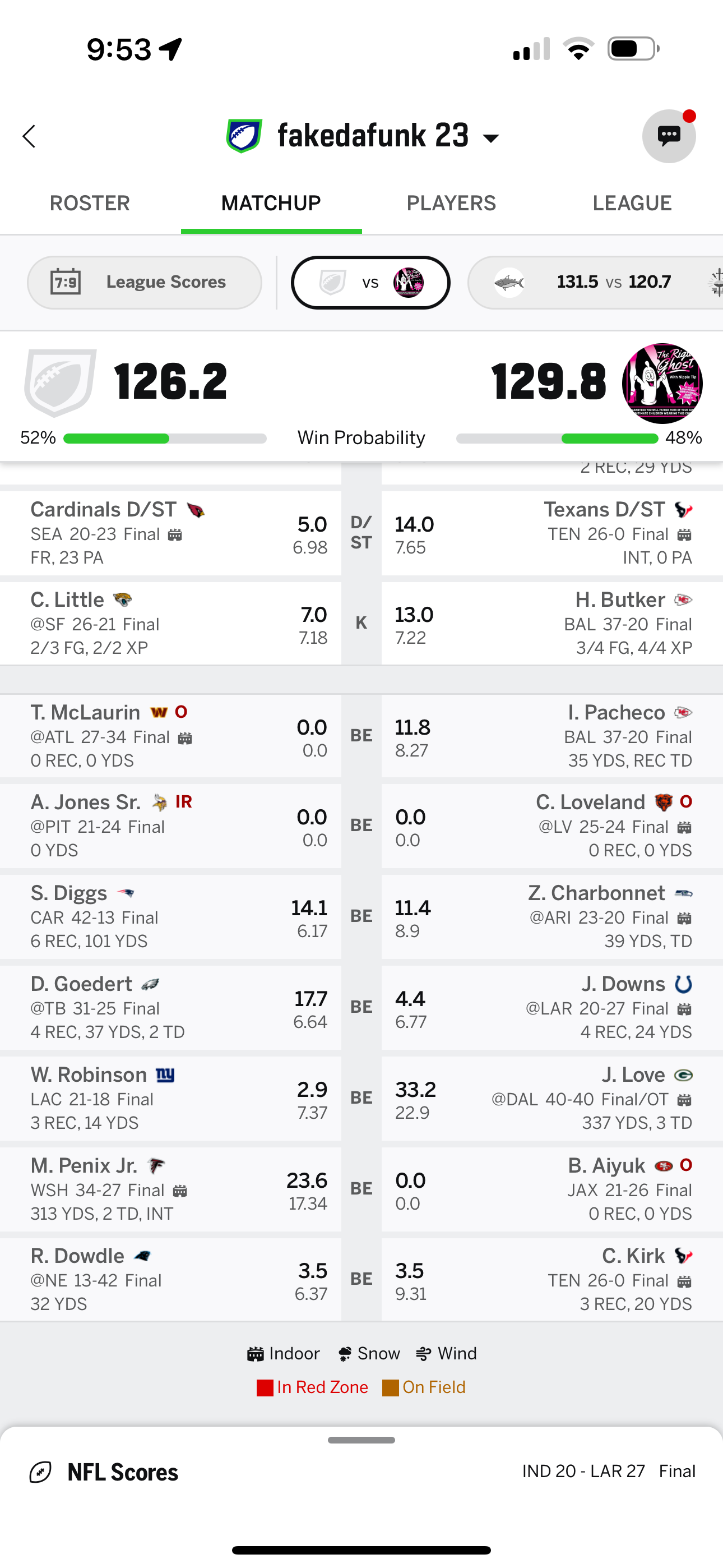 welp, boys, I’m in the final (again). my dumb league finishes this coming weekend and I think my #1 stud Nacua may be sitting….along with my #1 RB kyren williams.