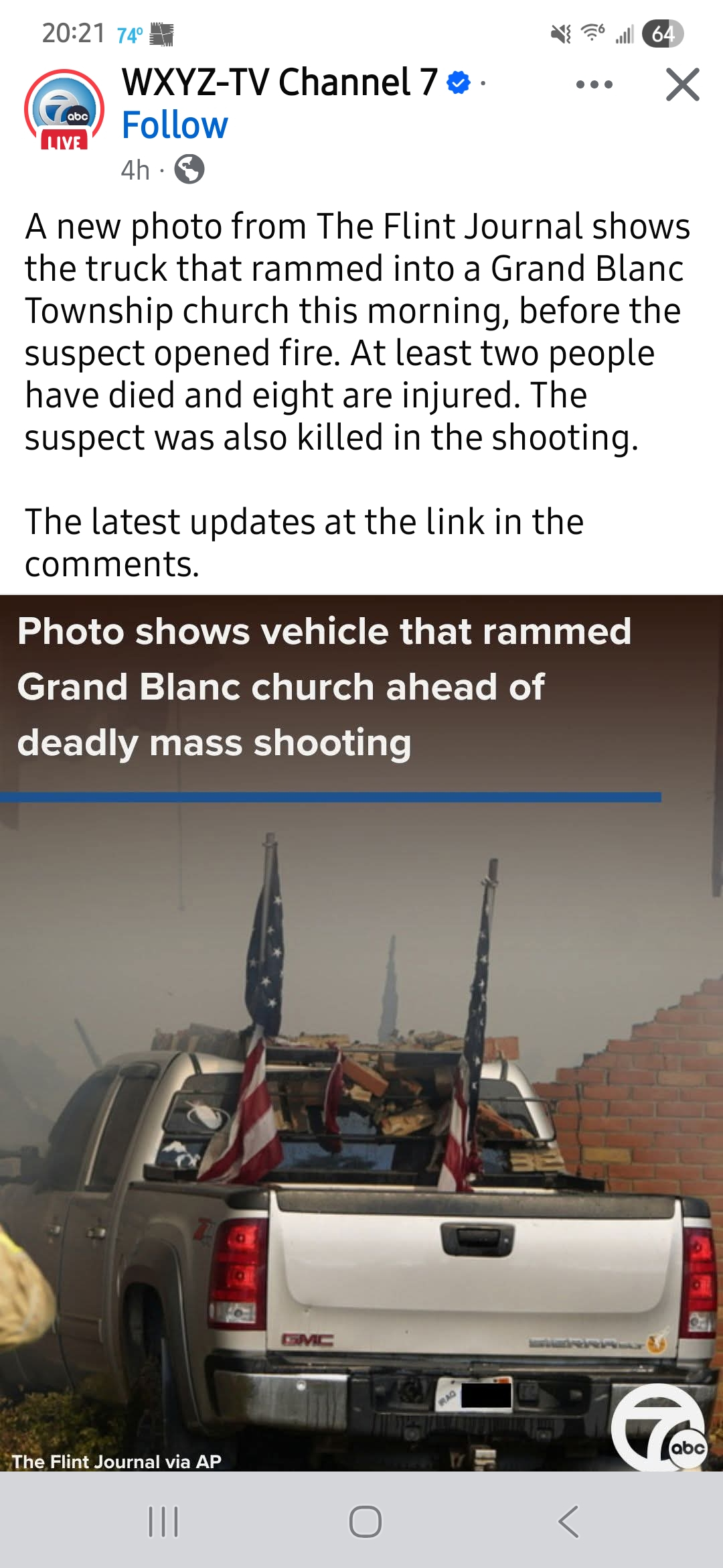 Hundreds of people were inside The Church of Jesus Christ of Latter-day Saints in Grand Blanc Township when a 40-year-old man rammed a pickup truck through the front door, then got out of the vehicle and started shooting, Police Chief William Renye told reporters. Police believe he “deliberately” set the building on fire.