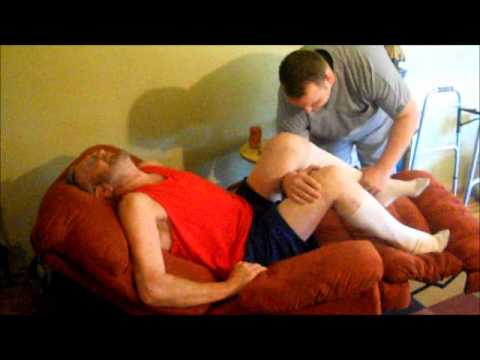 dude might shoulda done his exercises. this is not vvhat my therapist is doing to me but i am having a bad time like this poor bastard. im no expert but i don't think this guy done his leg bends. vvait till his dr. put him under & vvrenches on his legs/knees breaking thru all that nevv scar tissue & healing tissue, muscle & titanium teddy bears & vvhatnot