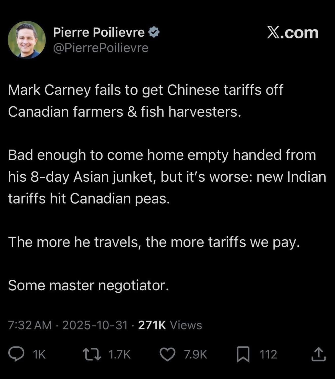 Zod said:It's so odd. I think I lean centre-right, so generally I should be voting conservative in most elections, but it just puts me off, when the only skillset I've seen someone have is to slag off the current leader/administration.If your going to do that, state what you would do different, and how you would do it.I'm not sure Pierre has any other skillsets other then being a politician that criticizes everything.If he stays on as leader, I'll either keep protest voting, or vote Carney (if the election came up soon) to give it some time to see if his policies end up working out.