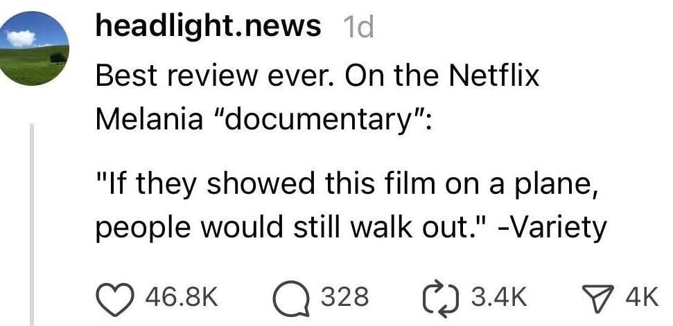 Memeania’s riveting life documentary is nothing more than a vanity bribe project from Bozos, for a whole host of reasons that are obvious, and to set Memeania up with her own personal wealth as she paid herself $28M of the original $40M of funding that was provided.
