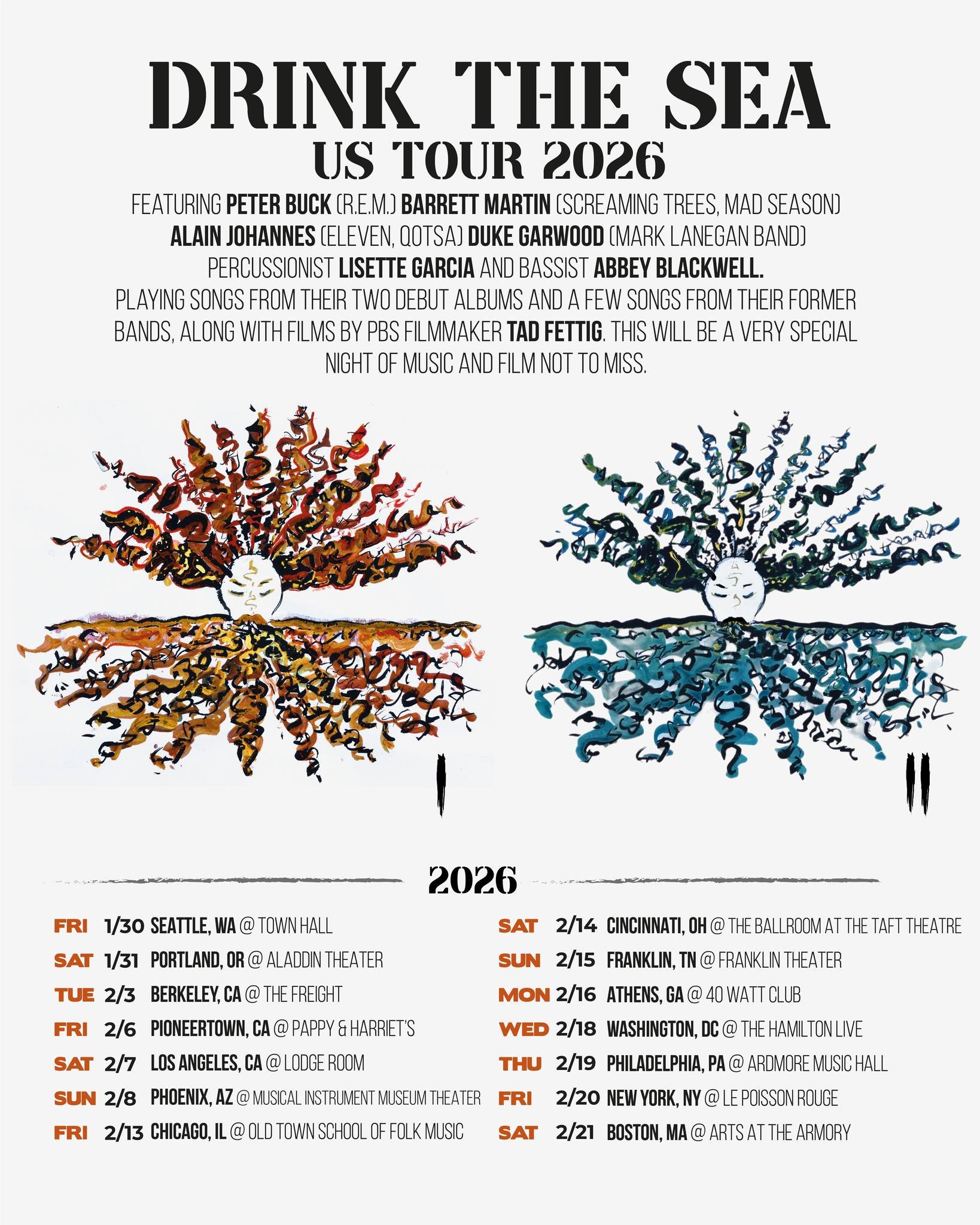 We are excited to announce tour dates for the DRINK THE SEA world tour. First up are US dates, which begin in late January and go through February. This will be a full evening of original music from our two debut albums, as well as some classic songs from our former bands. The line up is: Peter Buck (R.E.M.), Duke Garwood (Mark Lanegan Band), Alain Johannes (Eleven, QOTSA), Barrett Martin (Screaming Trees, Mad Season), percussionist Lisette Garcia, and bassist Abbey Blackwell. There will also be original films from award-winning PBS filmmaker Tad Fettig who will be projecting his original films from around the world, synchronized to the setlist. This is an evening of music and film you will not want to miss! Tickets are on sale now on the venue websites and also in the Events section of our pages. European dates will be announced this Thursday - thank you!