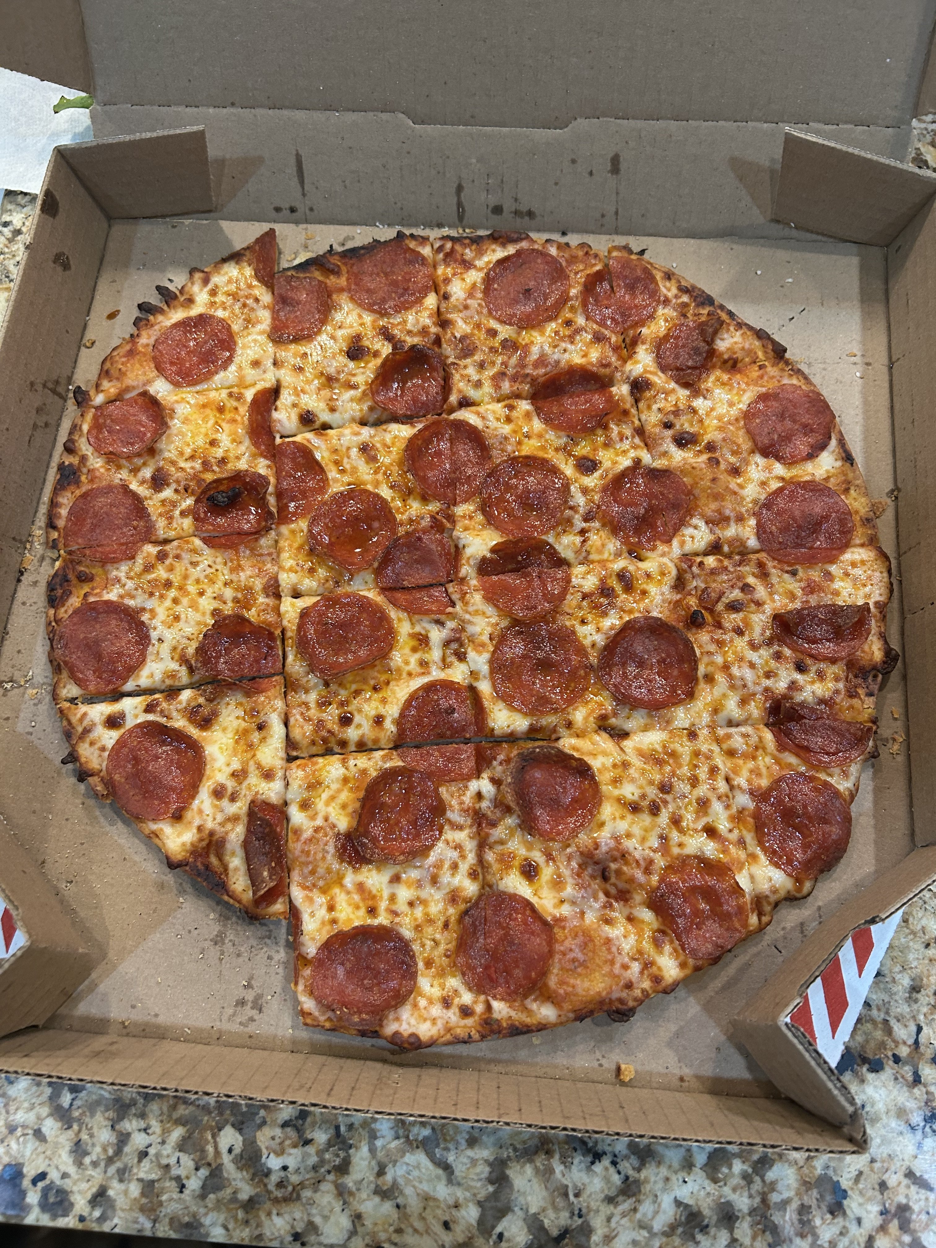 OK, fuckers, you told me if any Dominos was worth getting, it was the thin crust. So, I literally walked across the street to get one. It was a’ight. I easily could have eaten the whole thing but I left four squares.