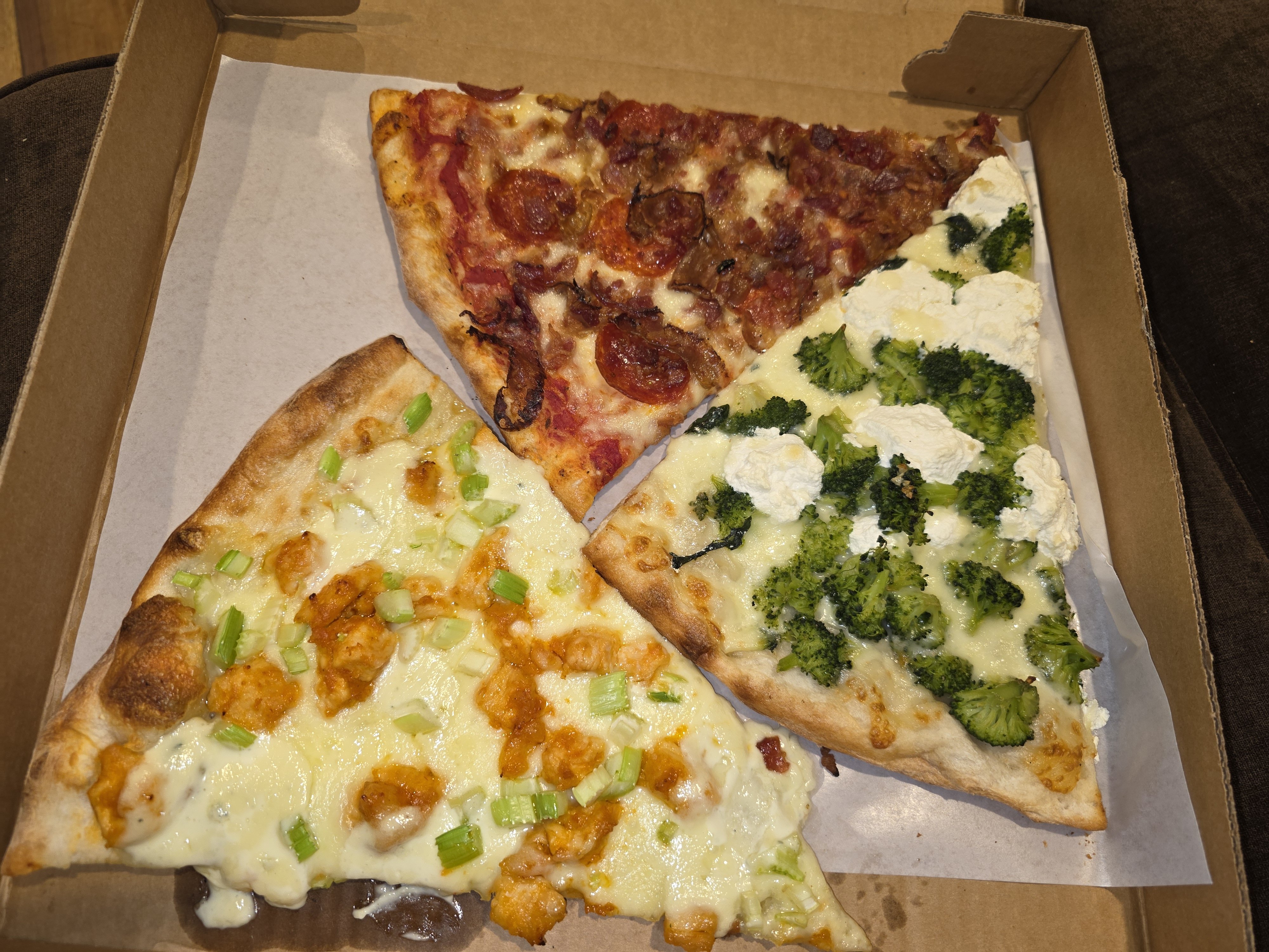 Buffalo chicken with ranch, meatlover's, & white with broccoli.