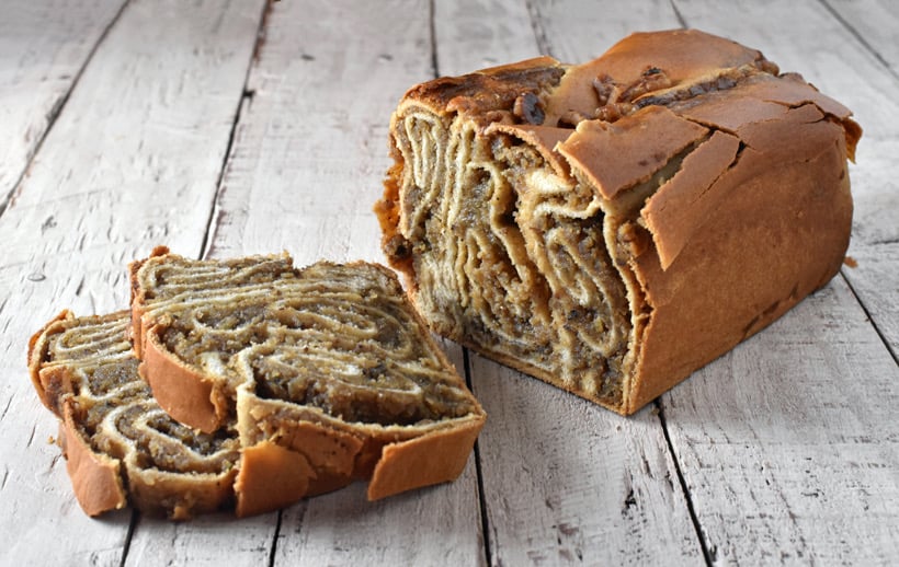 ground walnuts in honey and butter, wrapped in dough, folded into a loaf pan.