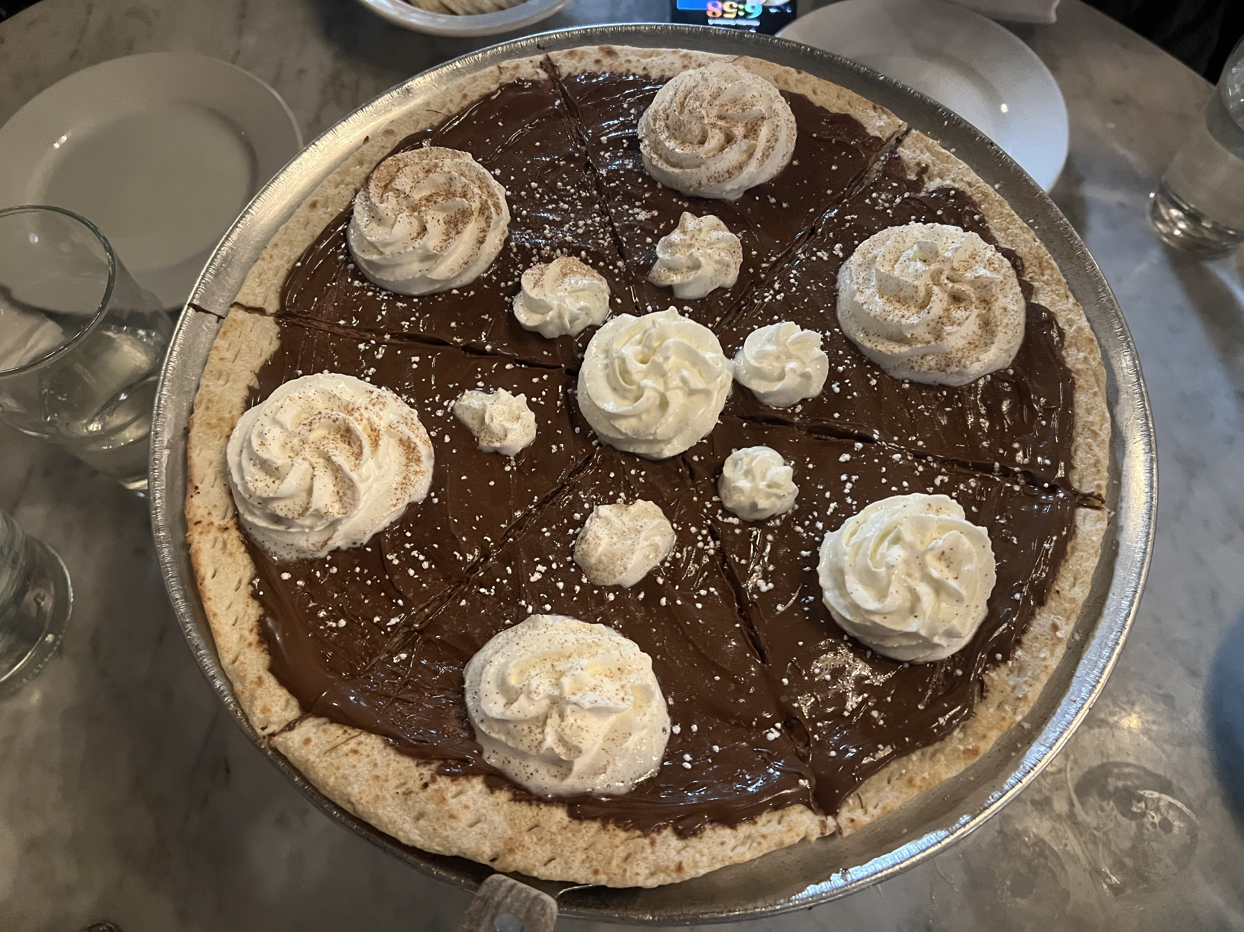 It was a perfect layer. Not too much. There was 5 of us. Crust was regular pizza crust. Savory and sweet. Bananas and strawberries on the side.