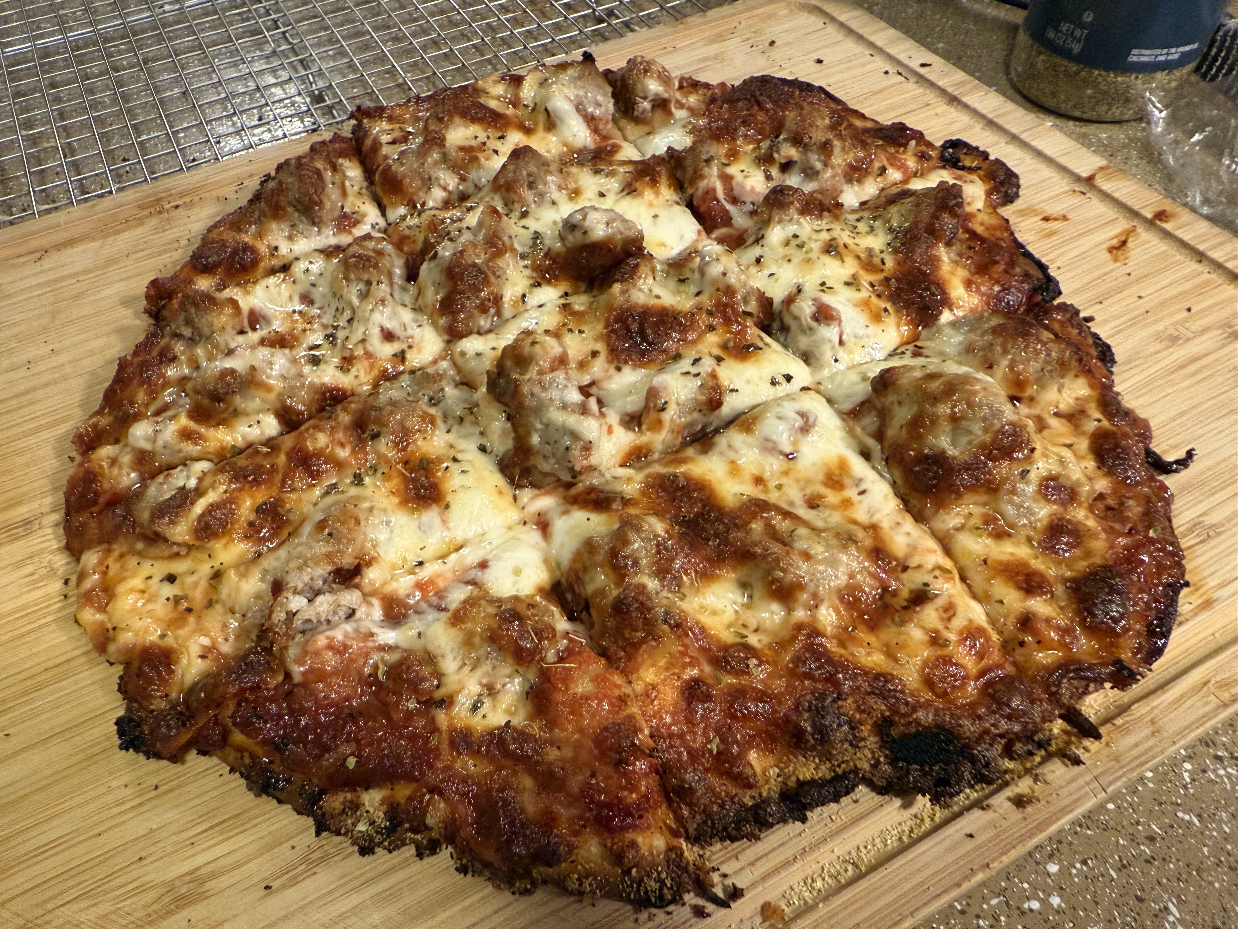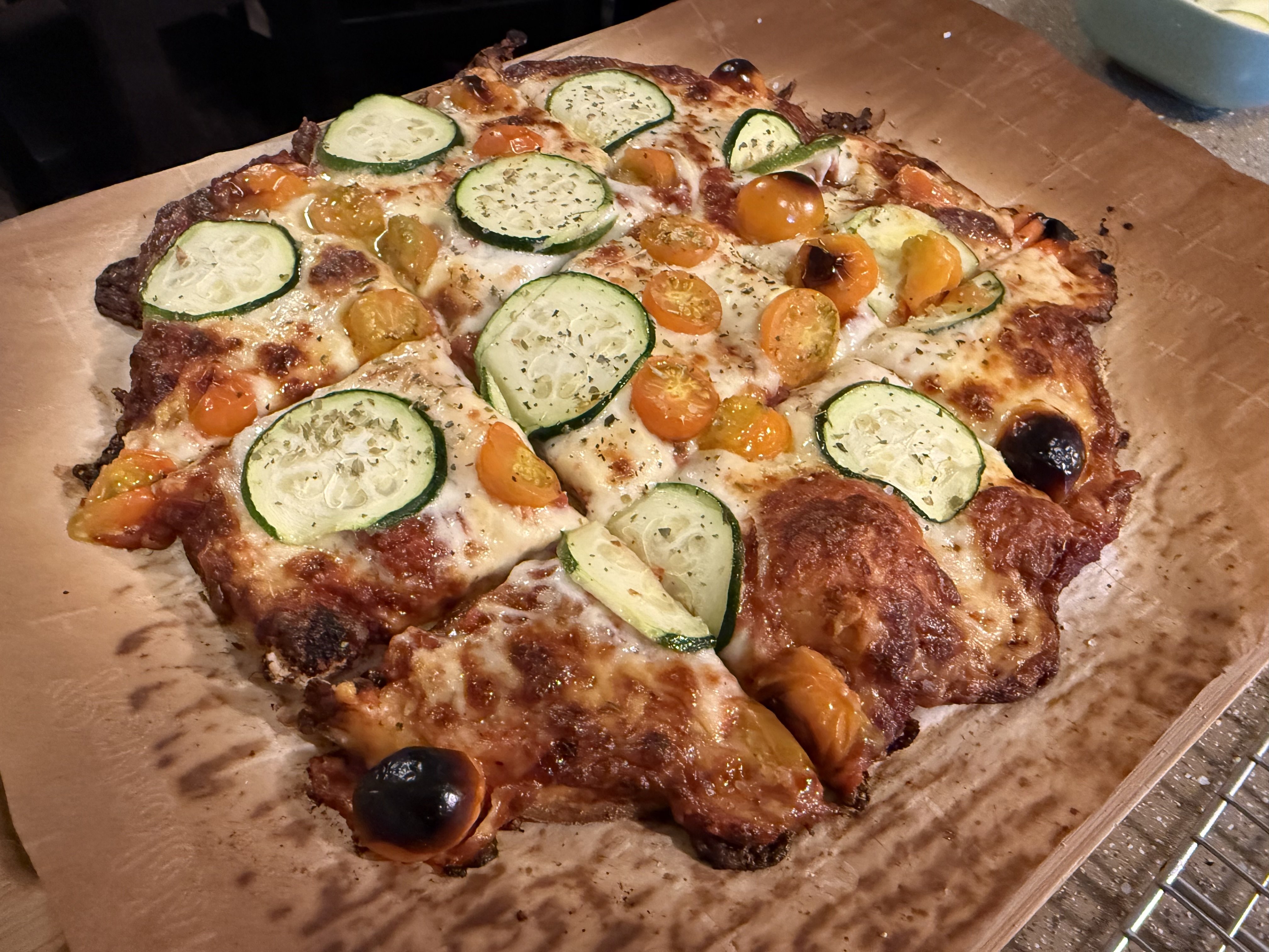 Recently I made some Chicago tavern style pizzas. My girlfriend is veggie, so I made one with zucchini, cherry tomatoes and garlic. The other is made with homemade sausage.