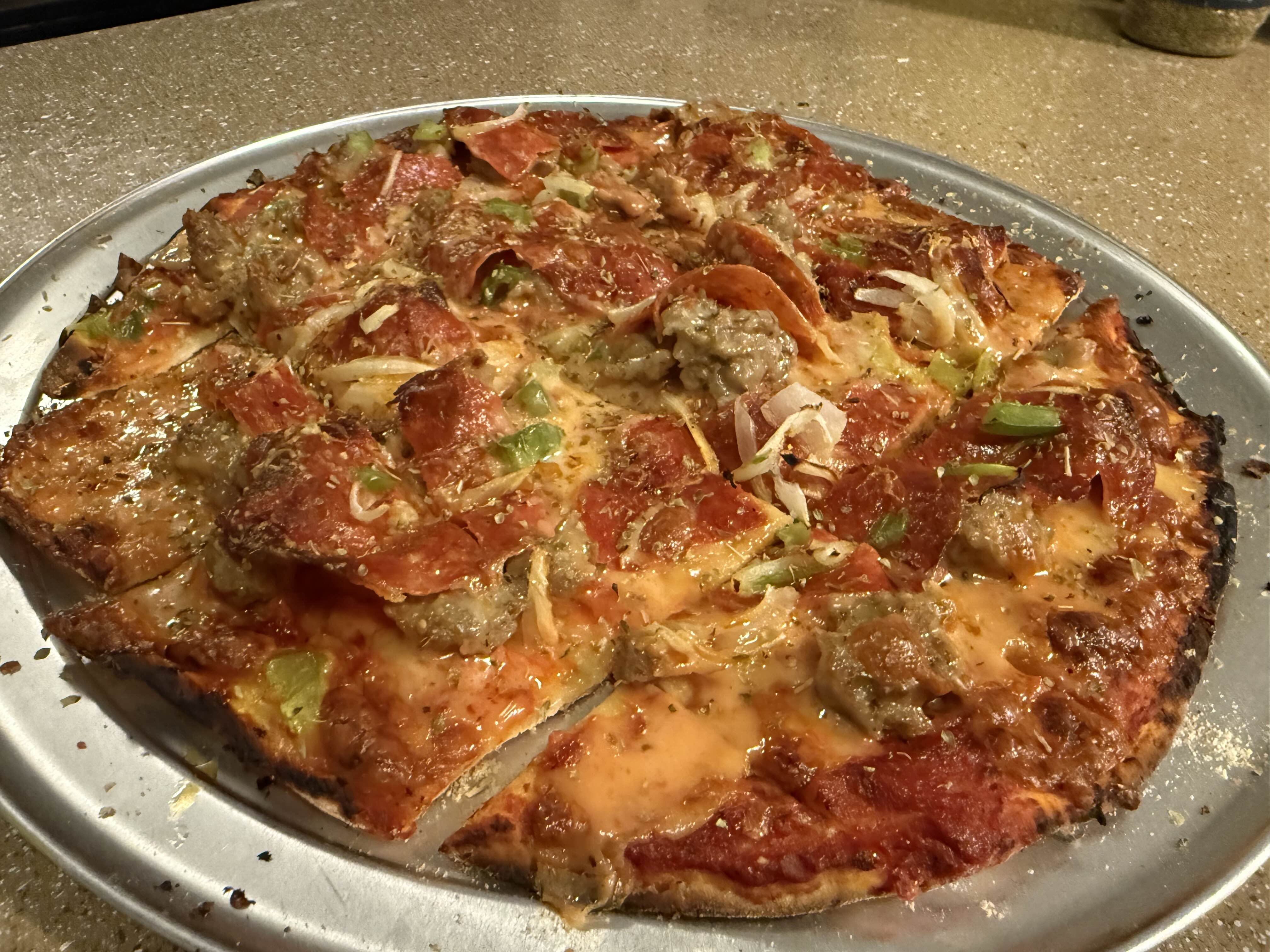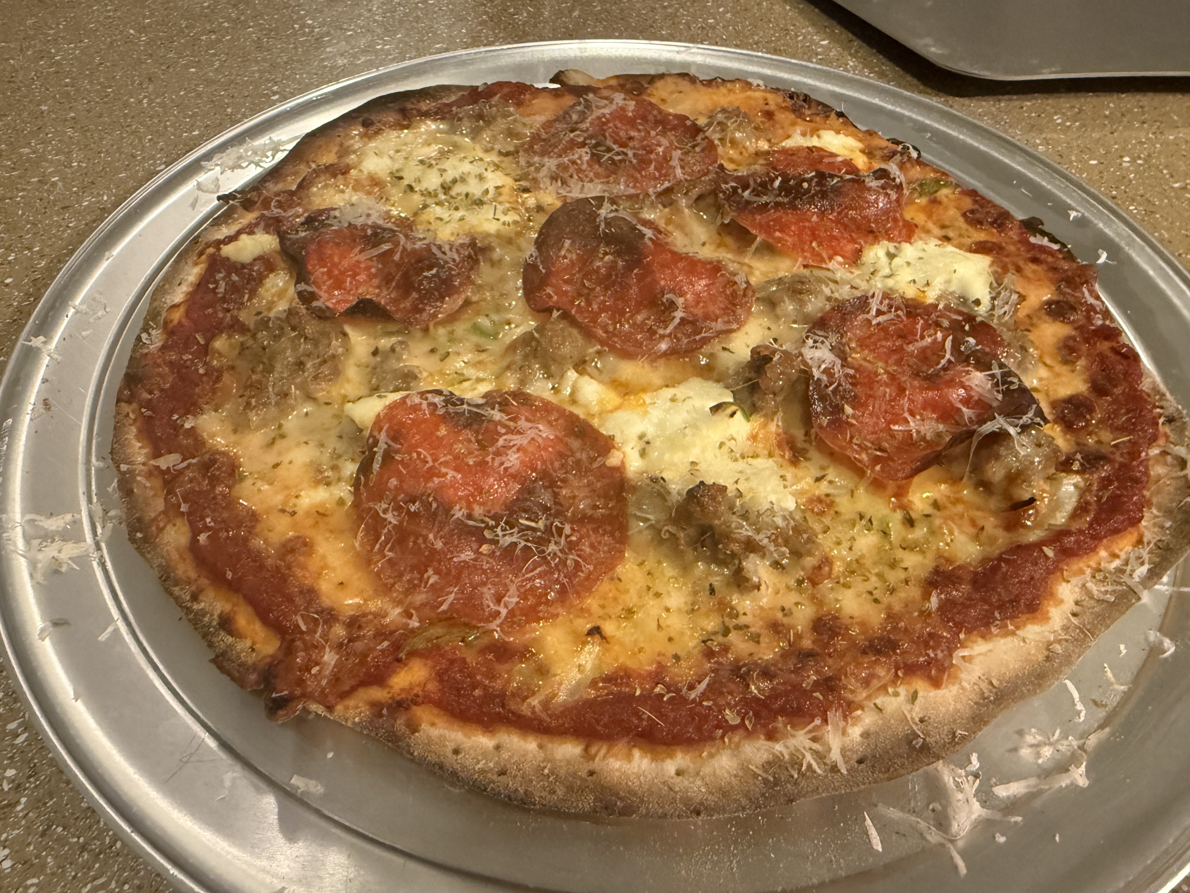 Decided to do a repeat of last night so I could use up the last of the sauce and the last of the provel cheese, but I didn’t have enough for two pizzas, so I grated some mozzarella and mixed it with the provel. I also replaced the olive oil in the dough with corn oil because I thought it seemed more Midwest appropriate. This pizza had sausage, pepperoni, green peppers, onion, and ricotta.