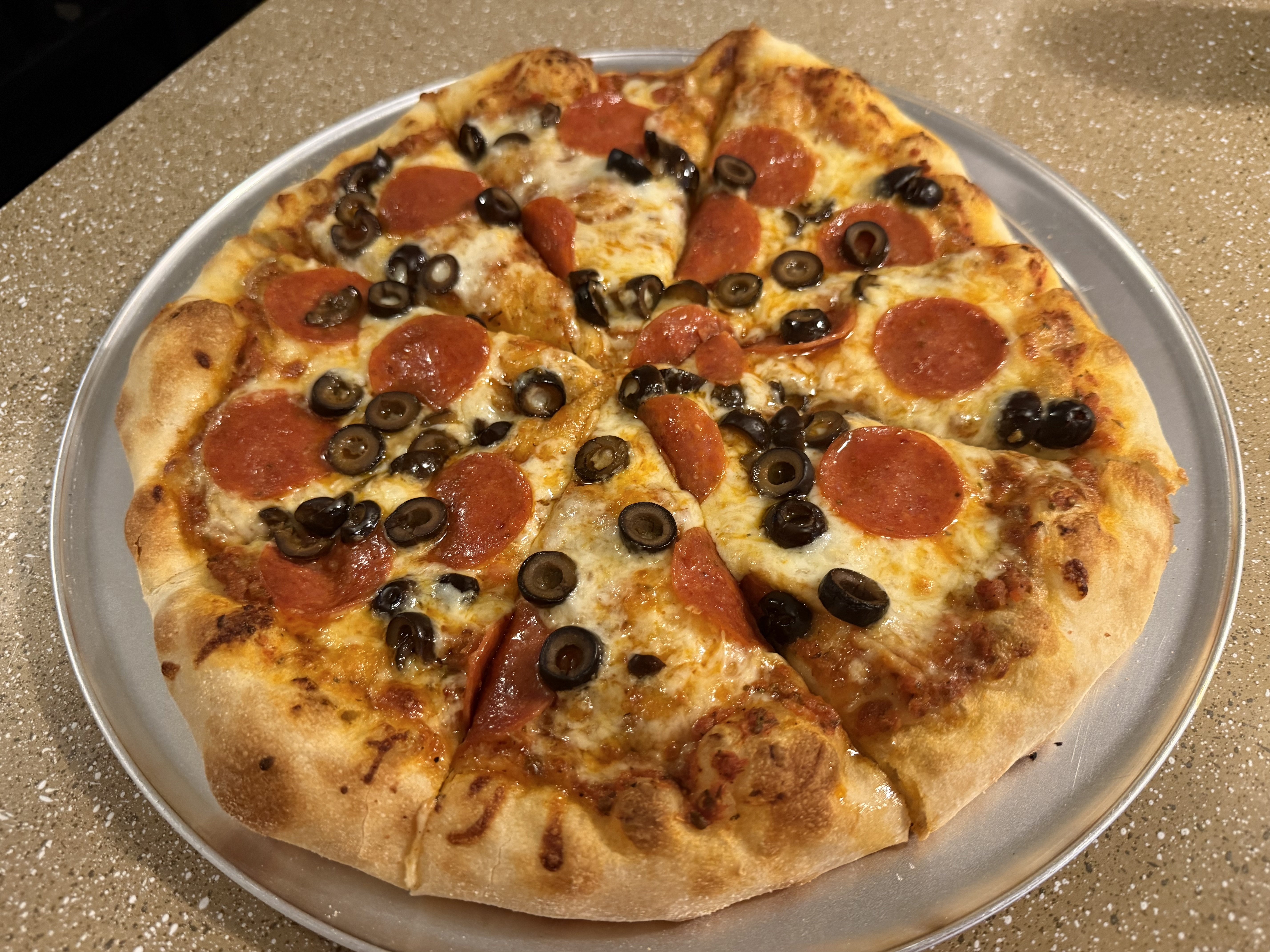 I had some dough and sauce that I needed to use. So I made a pepperoni and olive pizza.