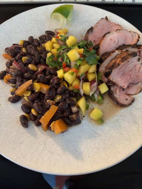 Grilled caribbean style pork tenderloin, mango salsa, black bean salad.