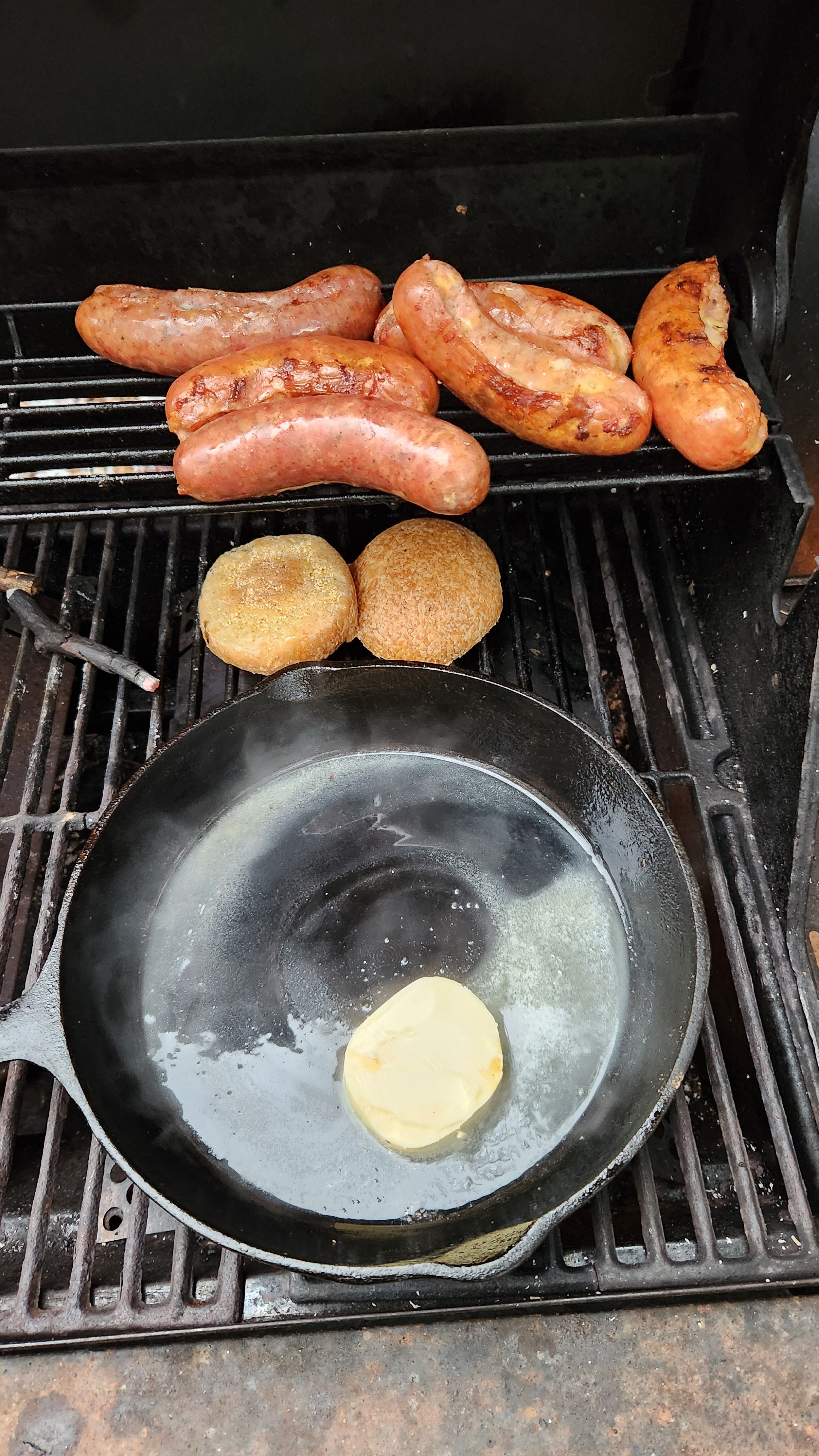 a bunch of 'wursts'. ..pot of spetzle. Drained and dropped in that pan with butter. Cracked pepper. Crisped them up a bit. Hacked up the wursts. Tossed in there. Yum. Good meal on a cold night. Could use something green in there. Peas maybe.