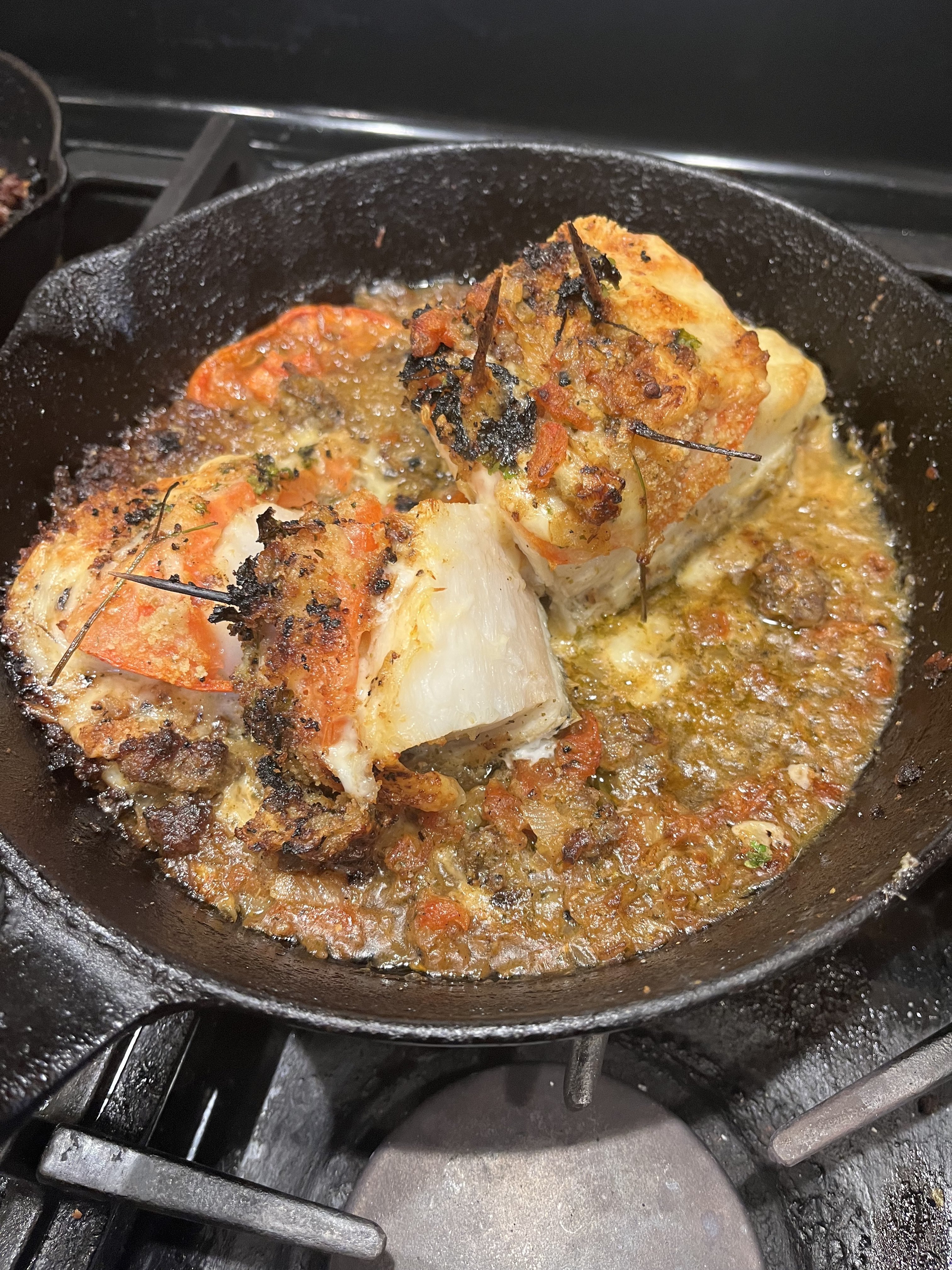 Chilean sea bass on a bed of ground sausage white cooking wine tomato and onion, topped the fish with fresh parsley sliced tomato and fontina cheese, brown the fish in the frying pan and once all the toppings are on put it in oven on broiling setting to melt the cheese.jesus greets me looks just like me ....0