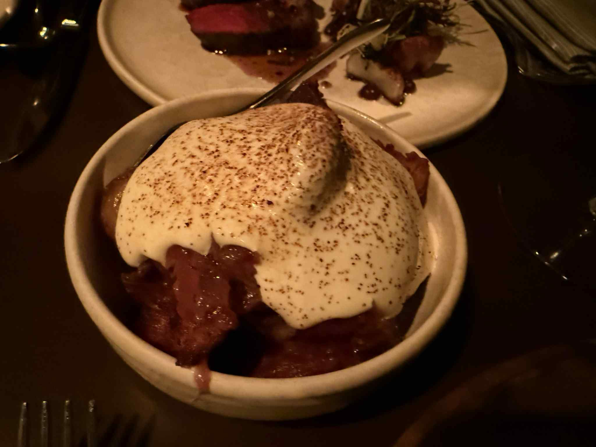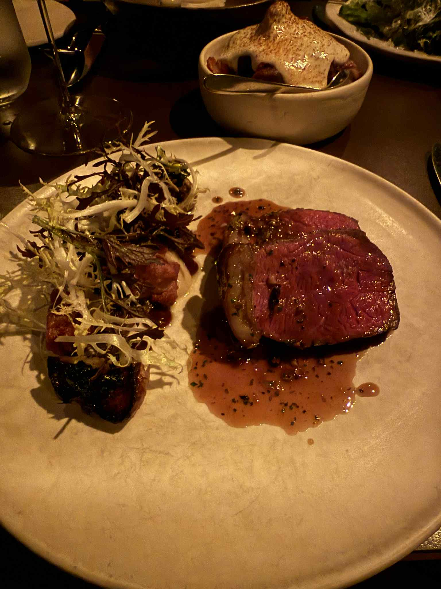 I had the Beef Coulotte, which had sunchokes, sauce bolo, crispy sweetbreads, and dolgo apple. All of the flavors worked very well. Delicious.