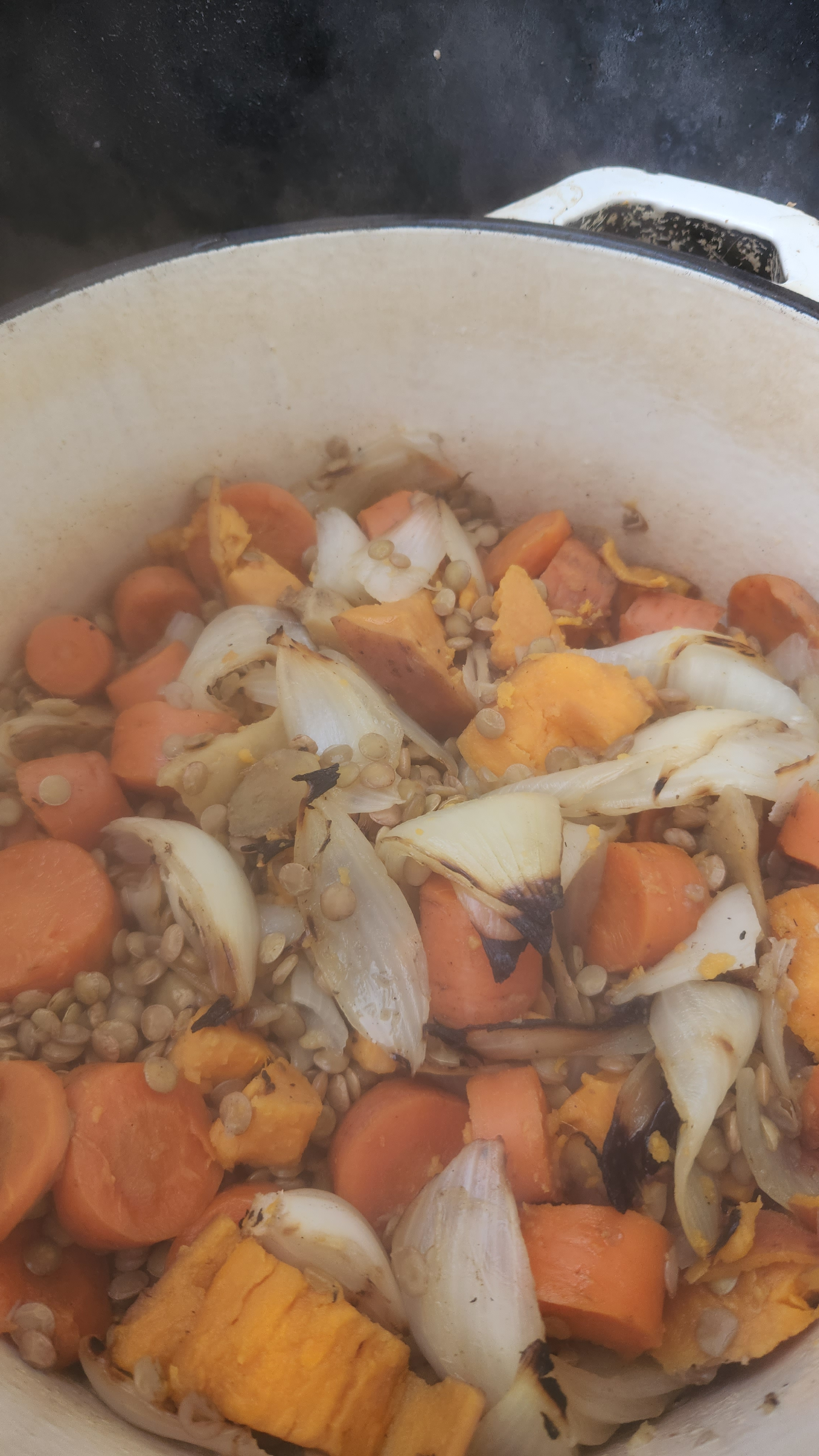 Thanks. Finally warm enough to cook outside. Lentils, sweet potatoes carrots, grilled onions ginger water. A little salt, cracked pepper. Could and maybe will add some broth to make it into a soup. Chicken is good. Had a jar of mustard, a little oil, lots of pepper, oregano a little salt.