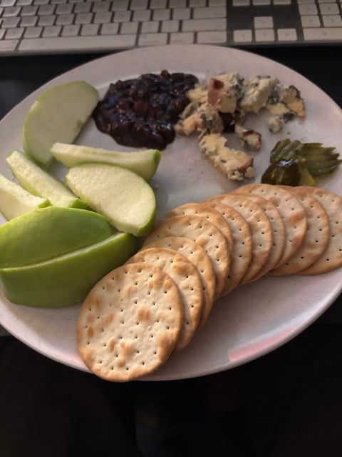 if you have ever been to the UK, then you know what a ploughman's lunch is.  My version and the Pickle and Stilton came from the UK. Sorry no spotted dick. @lastexitlondon