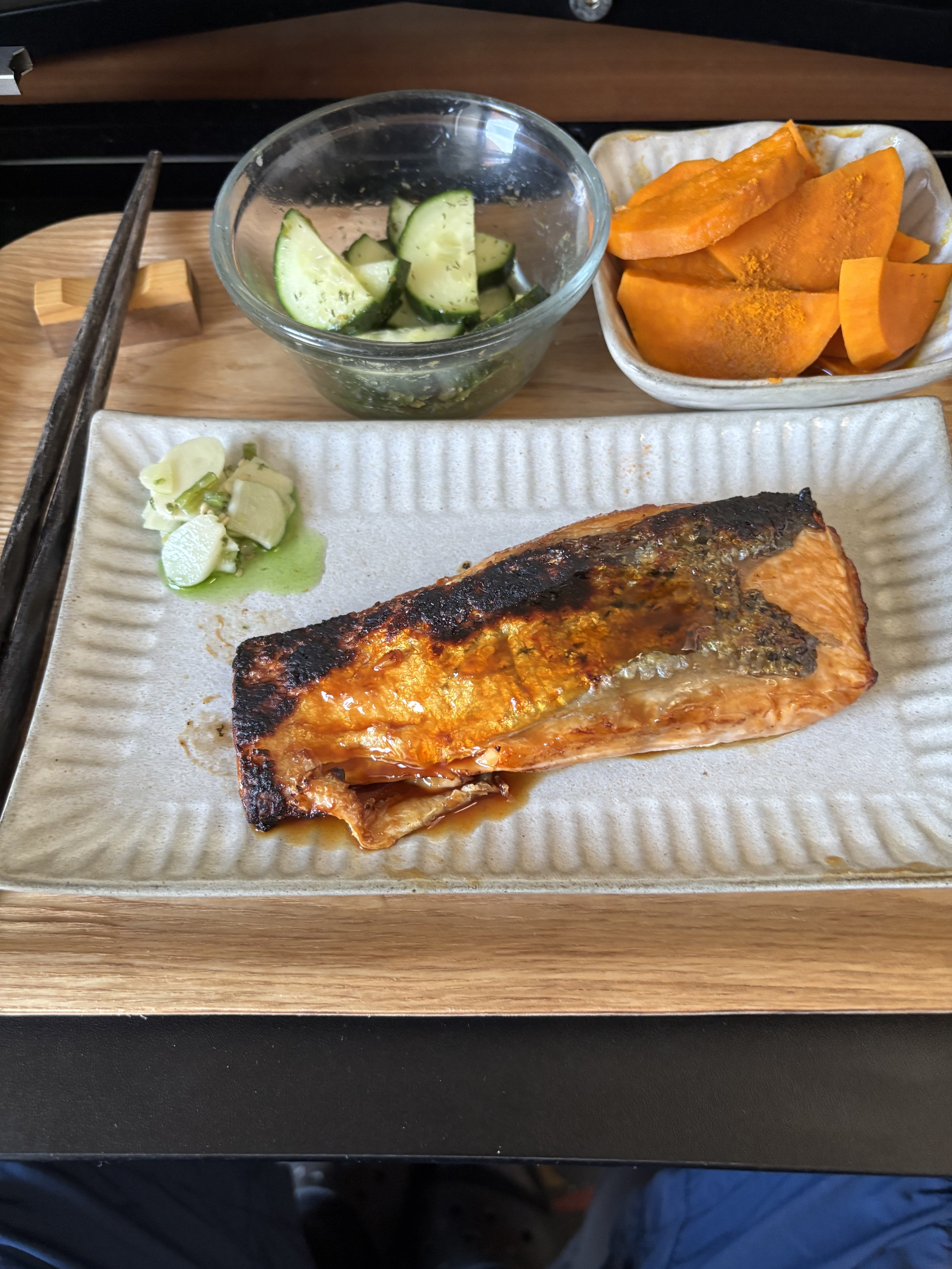 A light brush of avocado oil on the salmon skin then under the broiler. No other oil in those dishes. I wanted a side of clam miso soup but my fish guy was out of clams and I will not buy them from the supermarket.