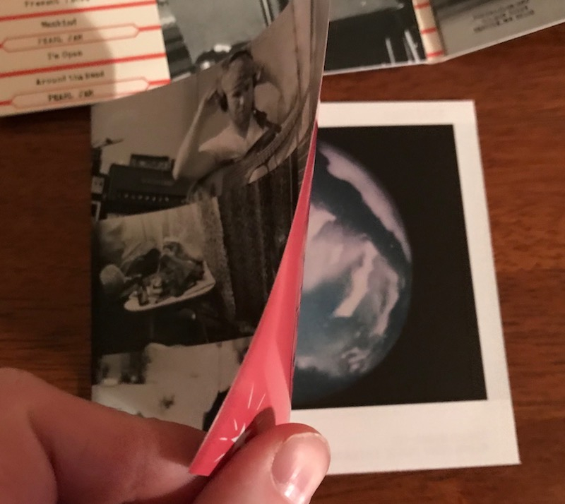 The double gatefold is now a single gatefold.  The front and back are present, but the inside shots (that flipped up) are missing completely.  The single gatefold houses a booklet on the left, containing artwork from the album.  Instead of 9 polaroids, the booklet features all polaroids backed with lyrics.