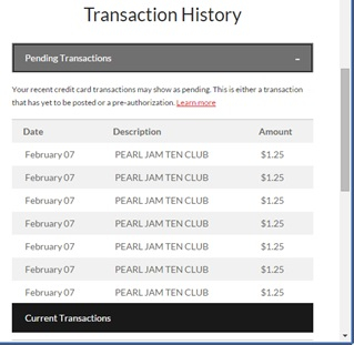 I received a notification from my CC app saying, 'Your credit card purchase for $1.00 at PEARL JAM TEN CLUB was approved' But no where on my CC transactions does it show that. Also, I haven't received an email confirming my lottery selections as of yet.0