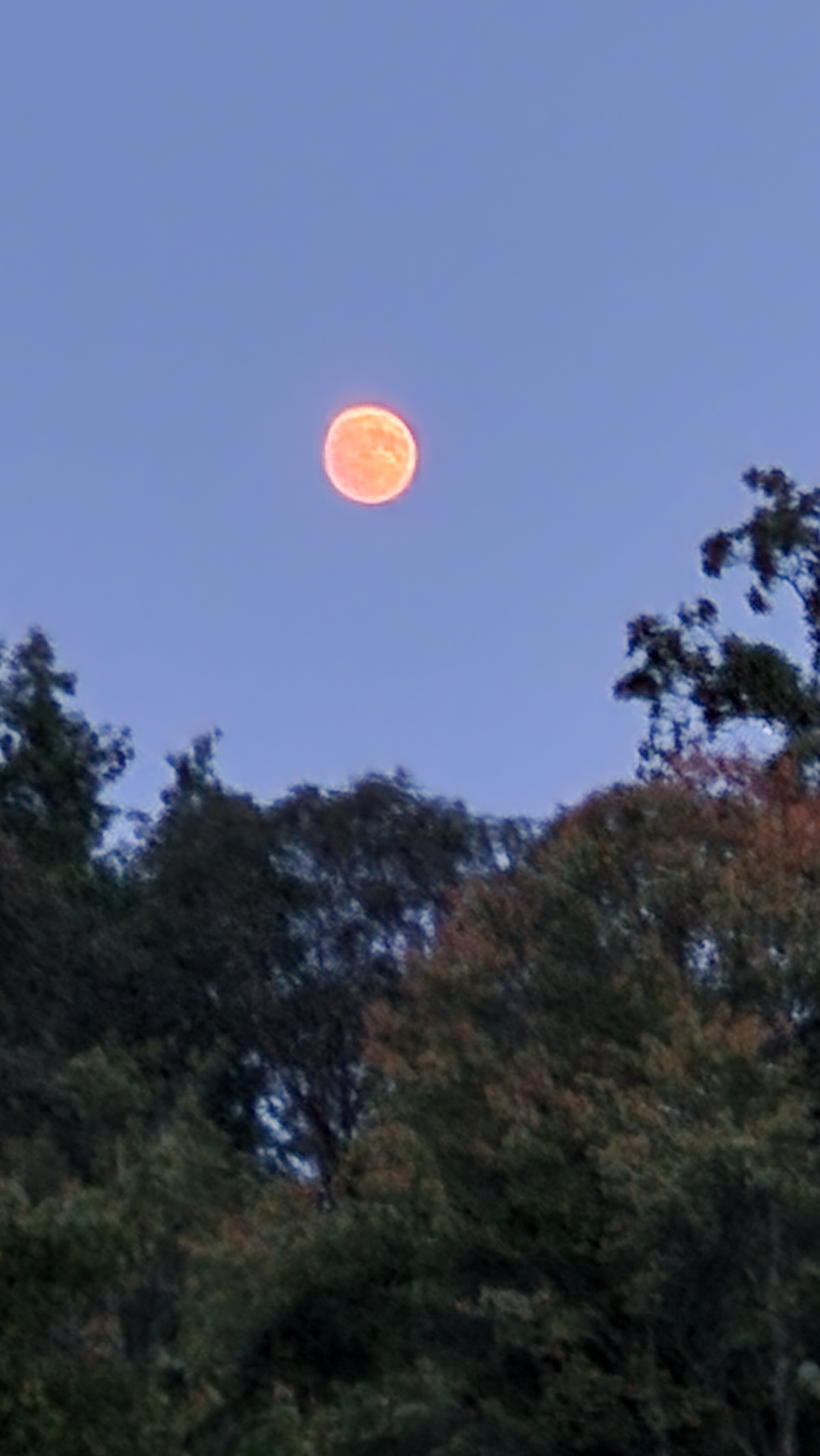 My pic is just ok, but we had that orange moon early last night. Really neat-o to see. I'd call it a 'cheese' moon! Then as it got later it turned back to regular moon color.