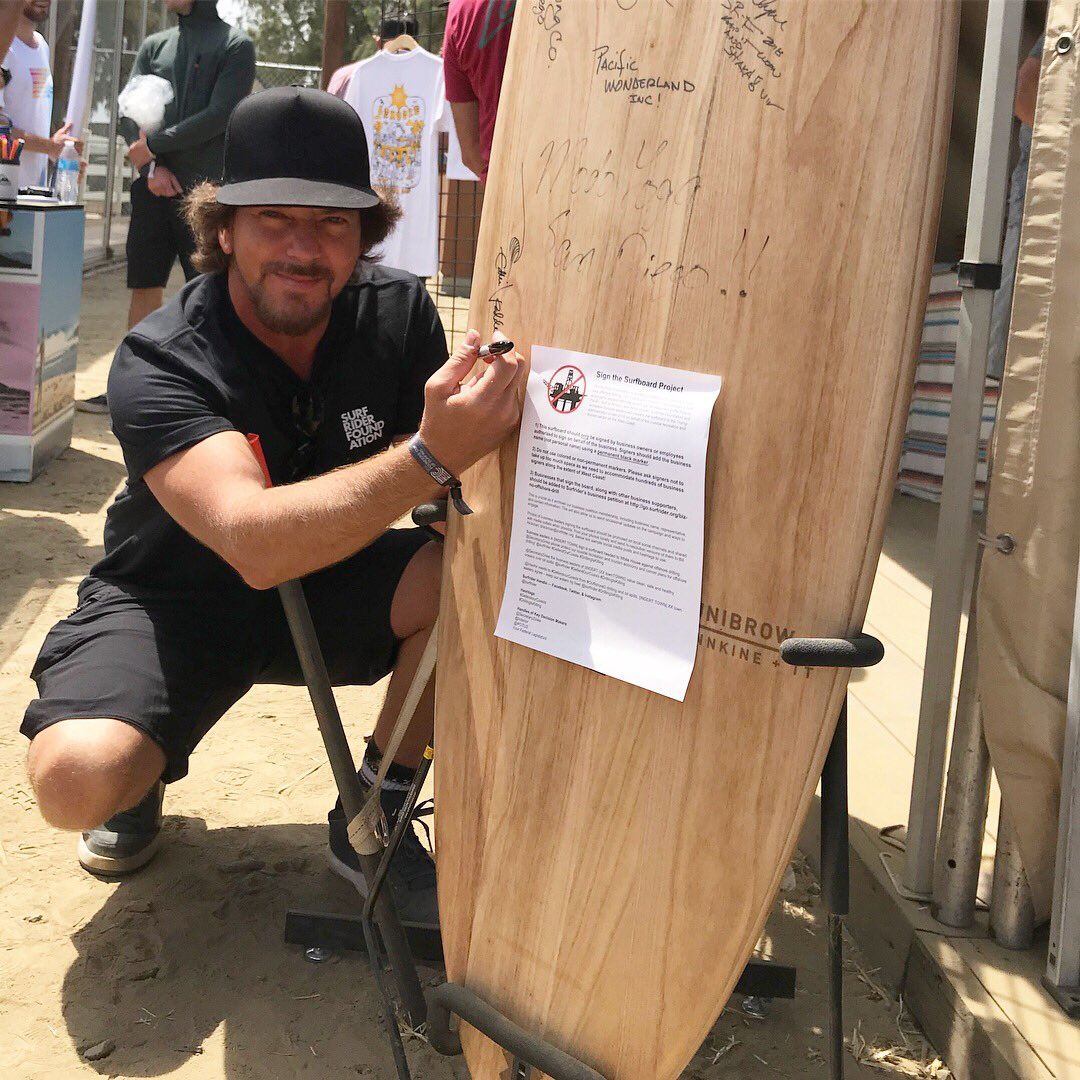 A huge thanks to lifelong @surfrider supporter and rock legend Eddie Vedder who came out to our booth at @wsl #FoundersCup this past weekend and shared his support against new offshore drilling. #DrillingIsKilling #EddieVedder @PearlJam #PearlJam #WSLpure