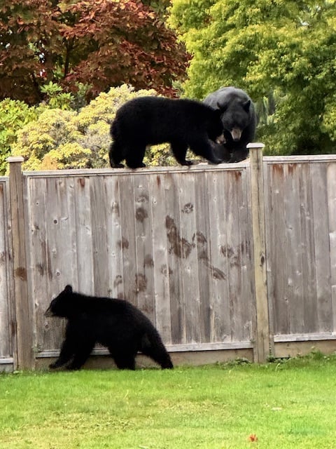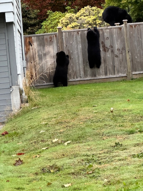 Mamma bear and her two cubs across the street in our neighborhood this week, I love the pullup the little guy is doing in the first shot.