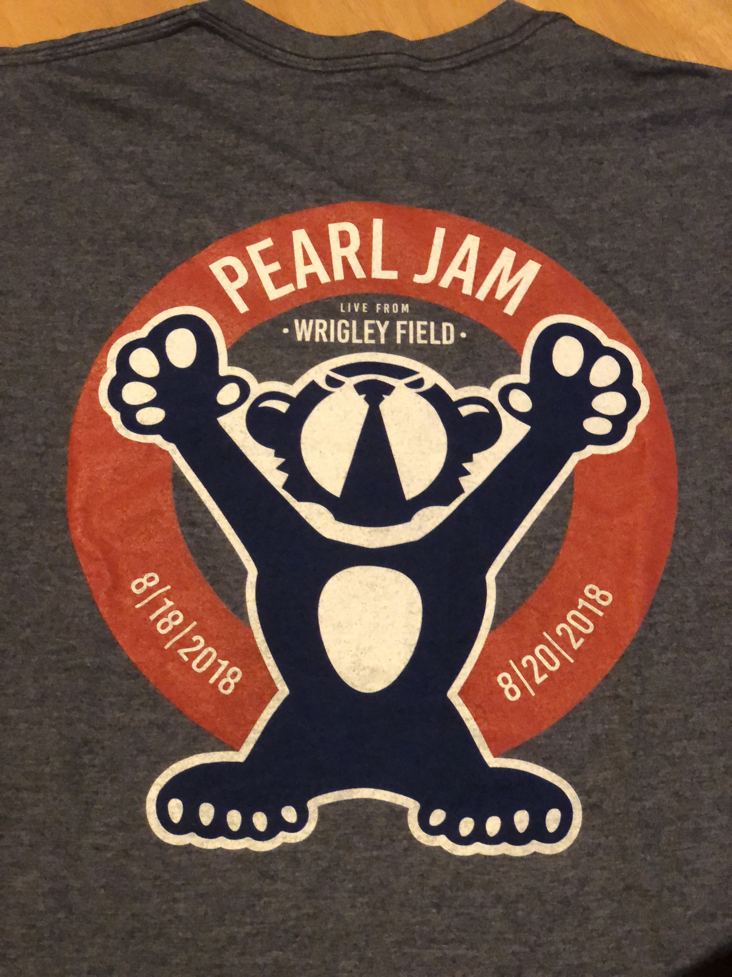 I absolutely love the 2018 10C shirt, so I wore that tonight. Son wore my (now too small) 2010 tour crossed flags shirt. Wearing Riot Act shirt or (bootleg) Vote For Change shirt my friends affectionately call "Skullfucker" for Wrigley 2.