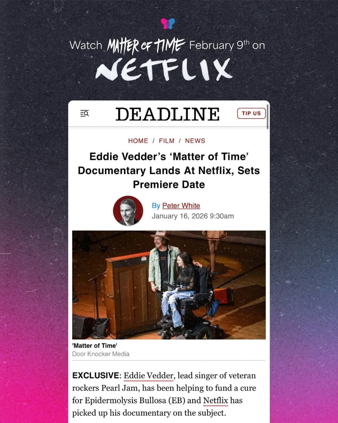 We’re proud to share that Matter of Time will premiere globally on Netflix on February 9, 2026.Matter of Time follows our fight at EB Research Partnership to cure EB, told through the voices of EB families, the researchers racing toward new treatments, and a community refusing to accept the status quo. Set against the backdrop of Eddie Vedder’s powerful Seattle benefit concert, it’s a story about what happens when urgency meets innovation, and people show up.We’ll be sharing behind-the-scenes moments from the film, stories from the EB community, and how you can activate and get involved to share the film with your community.After a 40+ city theatrical run, this story is ready to reach the world.Because for families living with EB, this isn’t just a release date.It’s a moment they’ve been waiting for. 🦋Read the Deadline exclusive here: https://deadline.com/2026/01/eddie-vedder-matter-of-time-documentary-netflix-premiere-1236684750/