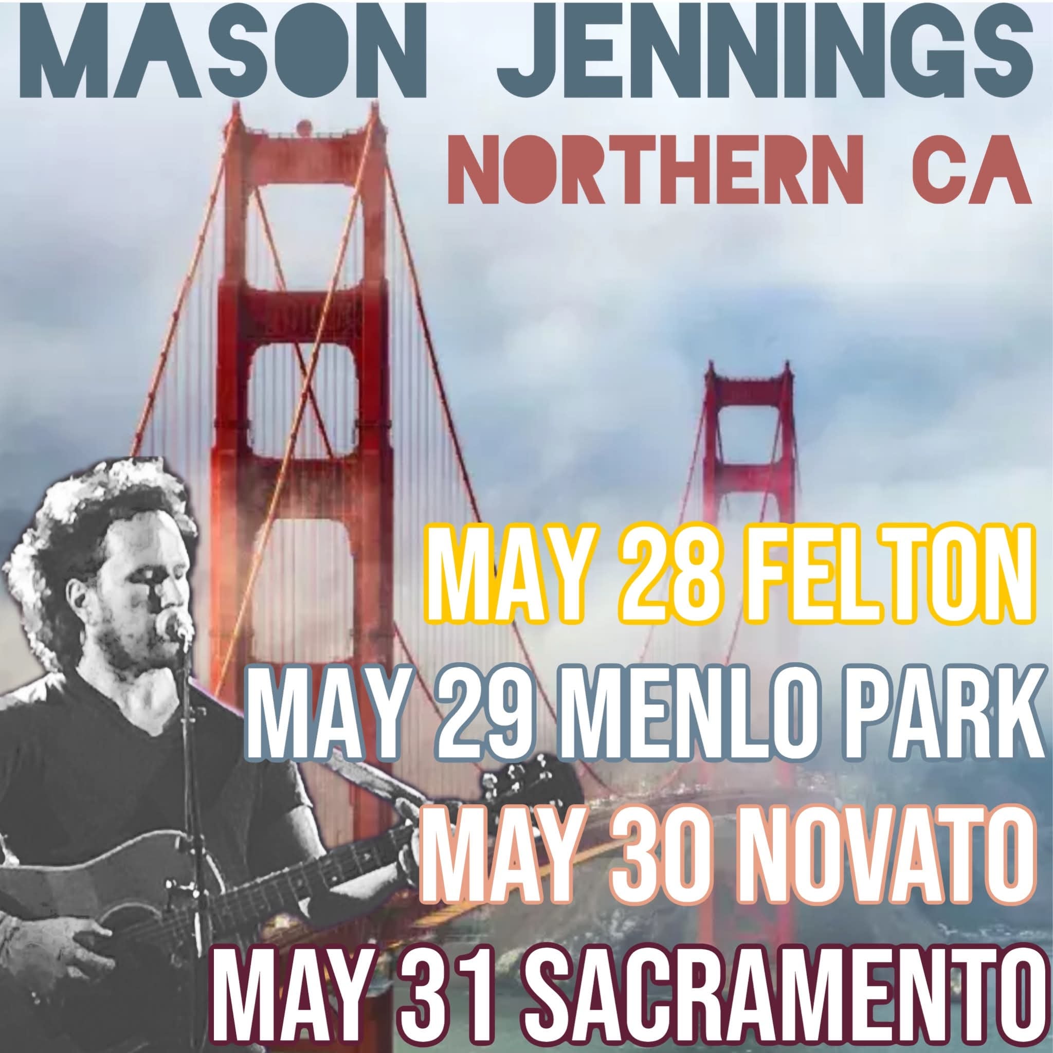 Just announced: I will be playing 4 shows in the Bay Area in May:-May 28 in Felton at Felton Music Hall-May 29 in Menlo Park at The Guild Theatre-May 30 in Novato at HopMonk Tavern-May 31 in Sacramento at Harlow’sTickets on sale today. Info at masonjennings.com and venue websites.Hope to see you there!