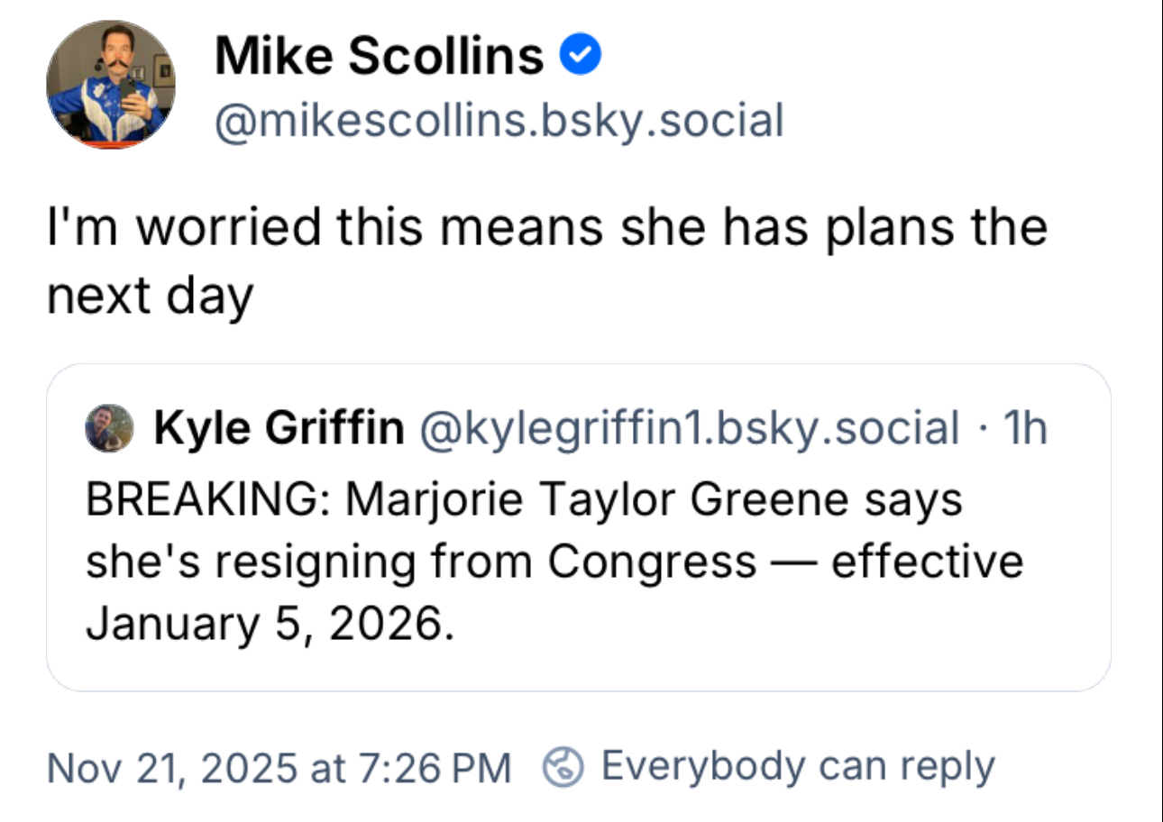 Looking forward to CCOOTWH’s scathing tweets to rub it in.GOP Rep. Marjorie Taylor Greene to resign in January