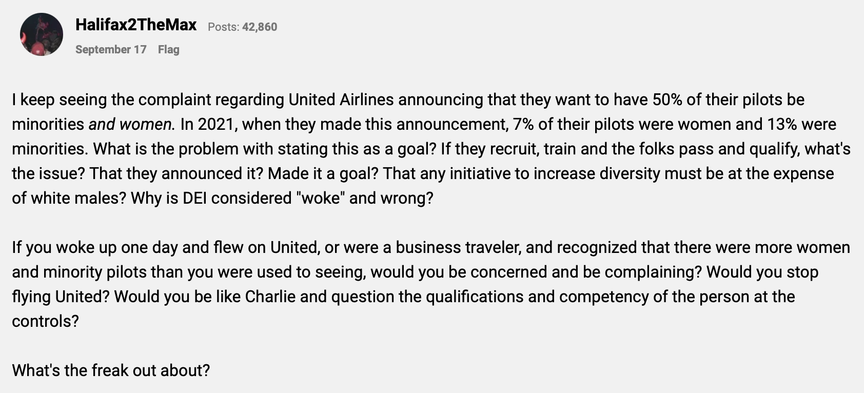 Lerxst kept stating publicly traded companies are replacing current employees and replacing them with women and minorities to meet quotas, and that these multitudes of SEC filings prove the immorality. I specifically referenced United Airlines and their goals in hiring new pilots. Not firing existing pilots and replacing them. Mace brought United into the conversation.