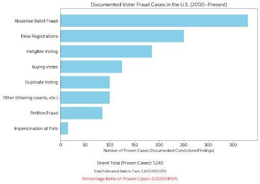 The following chart categorizes the "proven instances" of fraud (cases resulting in criminal convictions, civil penalties, or official judicial findings) and compares them to the total volume of ballots cast in U.S. elections during the same period.