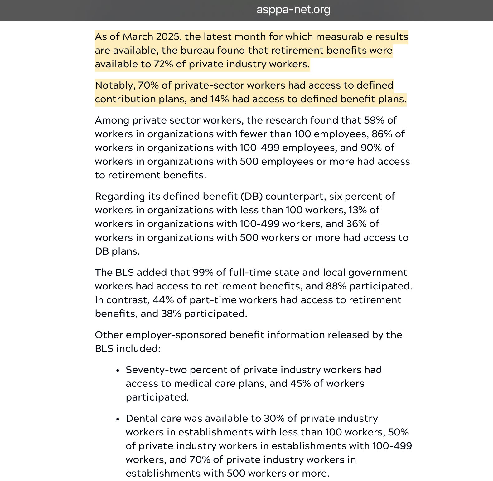 And there is no way to use your stats to make the conclusion you are trying to make. The data says most employers provide retirement plans, and the small companies that don’t offer it , you think that supports whatever it is you think you are claiming?…how many of those are self employed individuals with small businesses? Are you even aware how phenomenal the self employed retirement tax benefits are? They would absolutely fall into your phantom category of no 401k.