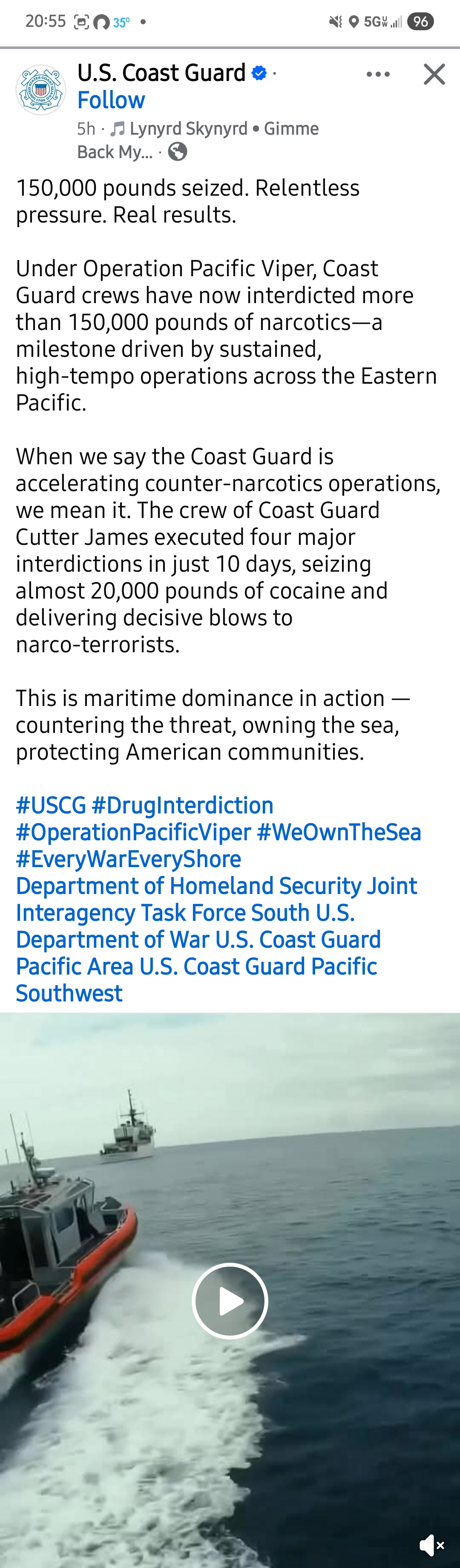 The footage, reported by Fox News, shows a Coast Guard sniper disabling a “go-fast” vessel during Operation Pacific Viper before officers board and detain those on board. The service said more than 20,000 pounds of cocaine were seized — the largest at-sea haul in over 18 years.