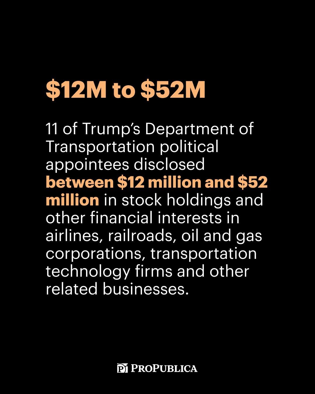 nothing to see here....ProPublica identified 32 political appointees at the Department of Transportation with industry ties, including 11 who recently held investments in transportation companies and adjacent industries.