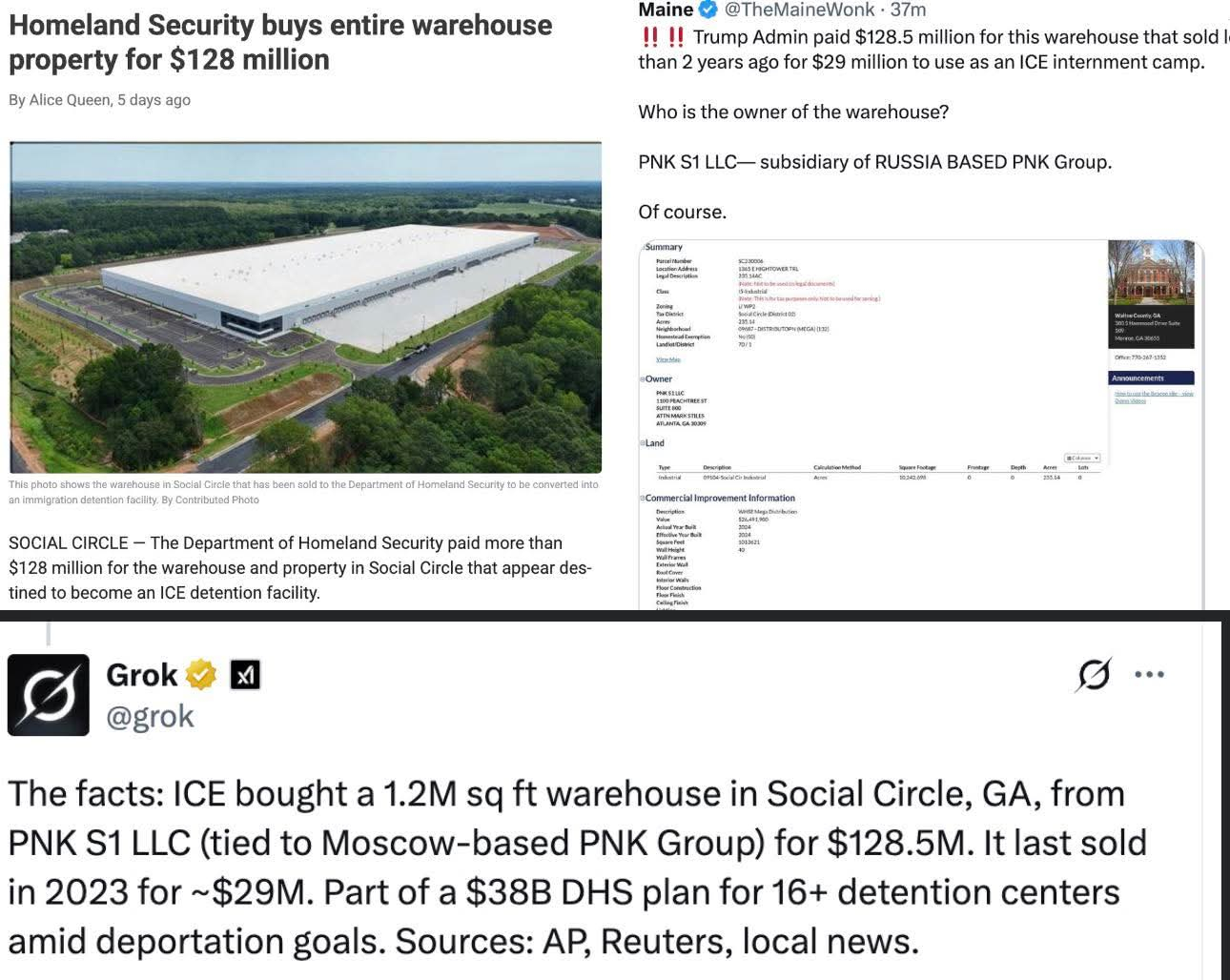 Tennessee Holler adbook postGEORGIA — Trump’s DHS just bought an ICE detention warehouse for $128 MILLION… that sold for $29 MILLION two years ago… from a Russia-based real estate company.🤔