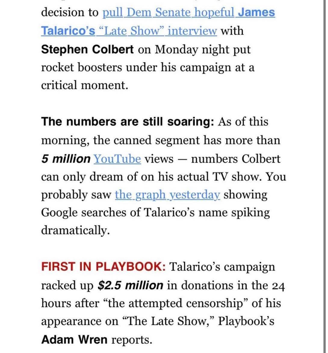 So the FCC ordered CBS to cancel Talarico's appearance on Colbert's show....really fucked up