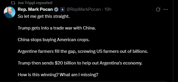 trump and his crew of dumbasses have China buying soybeans from Argentina. We are giving Argentina $20bil, they are dropping their tariffs on China, and US soybean farmers have no one to sell to.