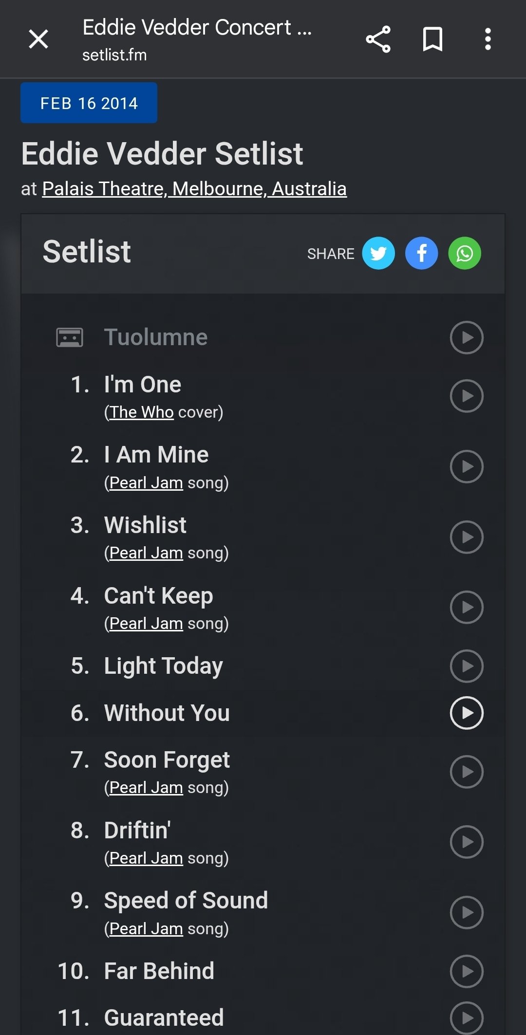 Song Wishlist: Alone, Let Me Sleep, Brother, full W.M.A., Hold On, Bugs/all of Vitalogy, Mankind, Around The Bend (full band), The Long Road, Don't Gimme No Lip, Pilate, Push Me Pull Me, All Those Yesterdays, Rival, Parting Ways, Ghost, Bu$hleaguer, WWS, Parachutes, Army Reserve, low octave Driftin', Strangest Tribe, Other Side, Undone, Fatal, Hitchhiker, Education, Black Red Yellow, Of the Earth, Love Reign O'er Me, Gonna See My Friend, Santa Cruz, Infallible, Yellow Moon, Alright, Comes Then Goes, and the Mamasan Trilogy.Wanted Posters: WPB '98, Tampa/WPB '00, Tampa '03, EV Batmobile '08ISO: any picks, or setlists from any of my shows!0 -