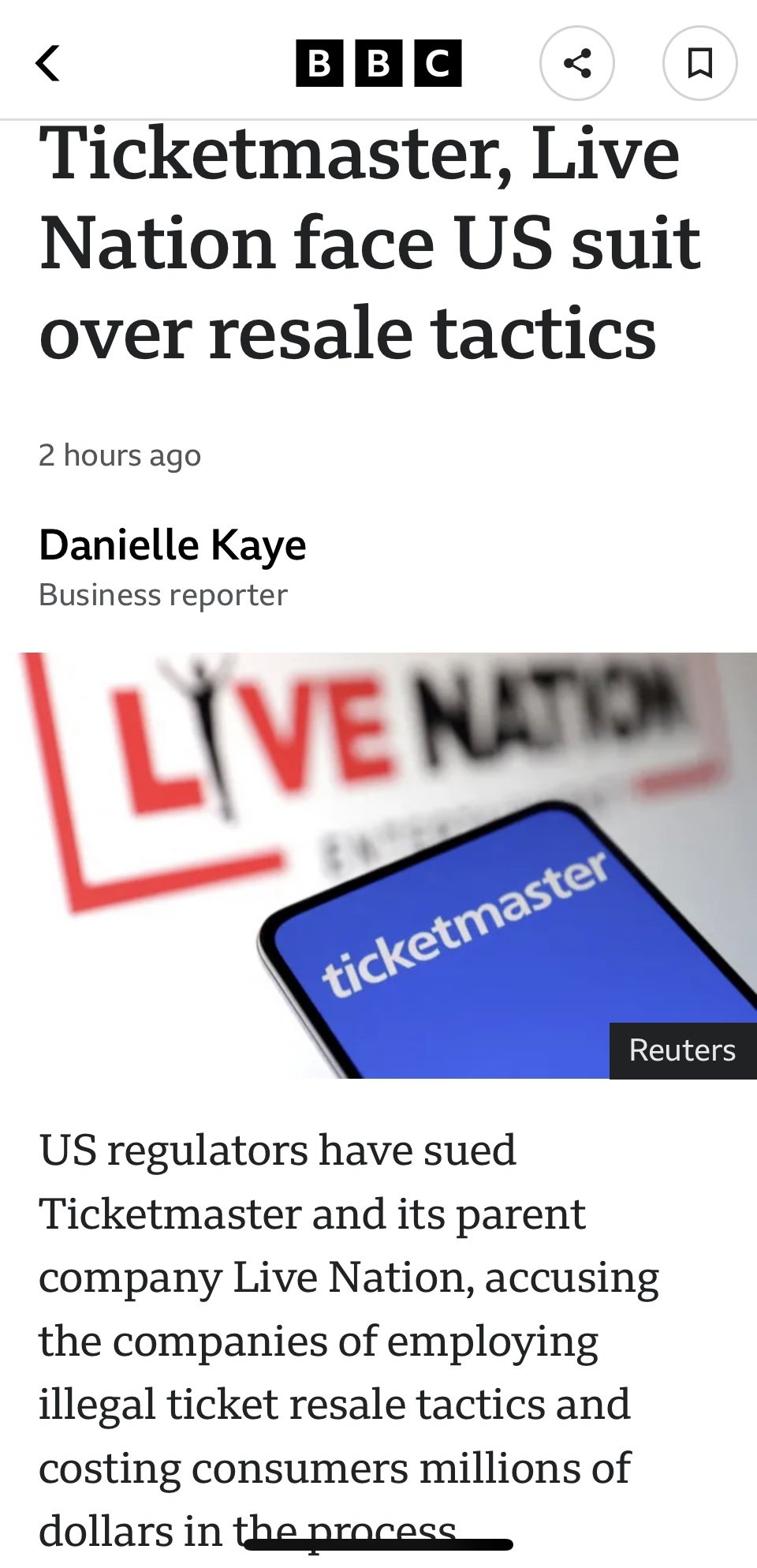https://www.ftc.gov/news-events/news/press-releasesback to TMThe FTC press release - a section:(…) Ticketmaster is the leading provider of tickets for concerts—controlling about 80% or more of major concert venues’ primary ticketing—and it also has a growing share of ticket resales in the secondary market. From 2019 to 2024 alone, consumers spent more than $82.6 billion purchasing tickets from Ticketmaster.