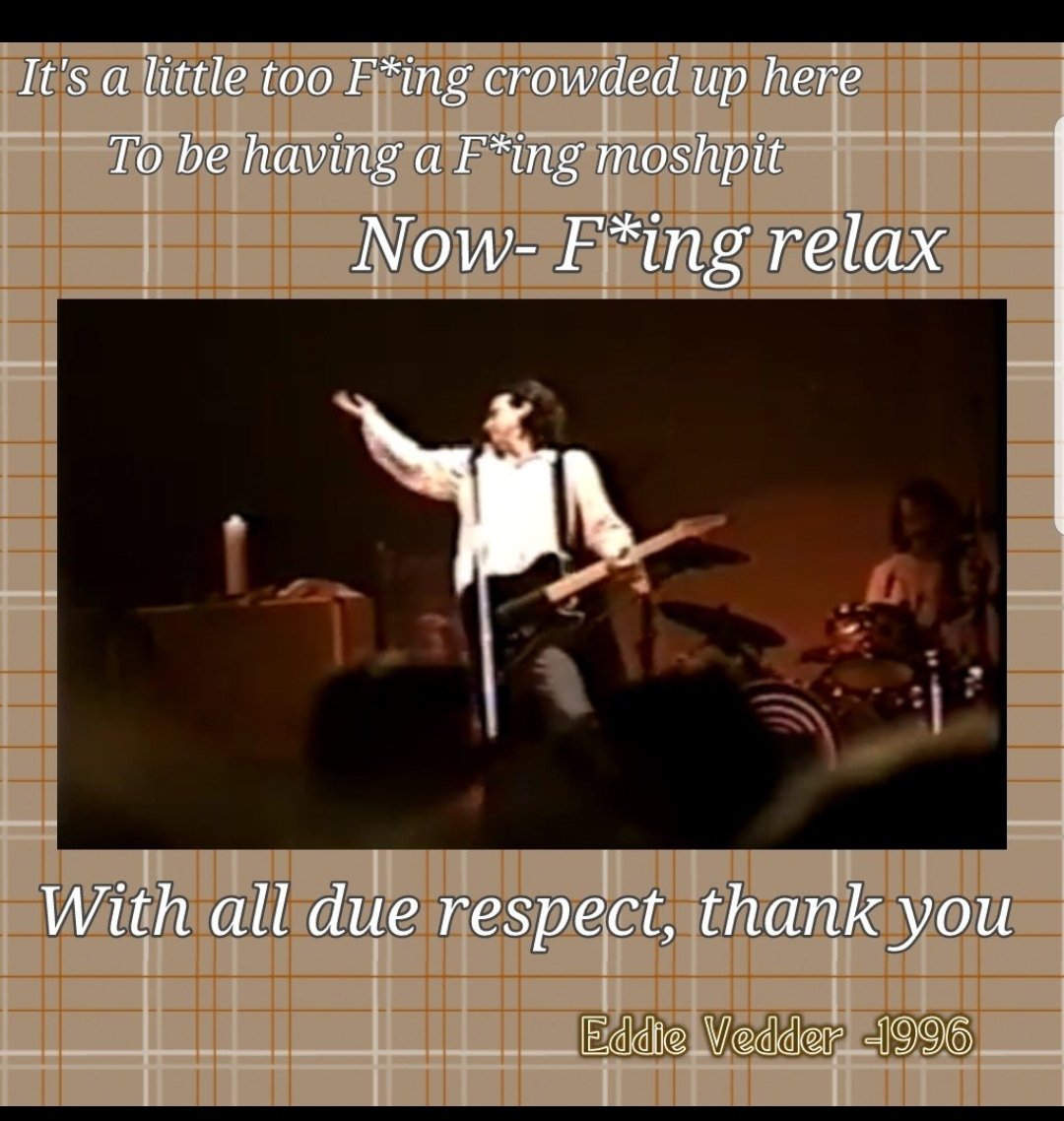 Randall’s Island, 1996, N2. Things were getting a little hairy in the crowd — I remember it being pretty tightly packed down there — and Ed pleads with folks down front to calm down a bit with the pit. They keep going, and Ed admonishes them a couple more times. The last time, he’s just pissed, and asks if some of them had escaped from the “loony bin or mental hospital” that was nearby.✌🏼❤️0