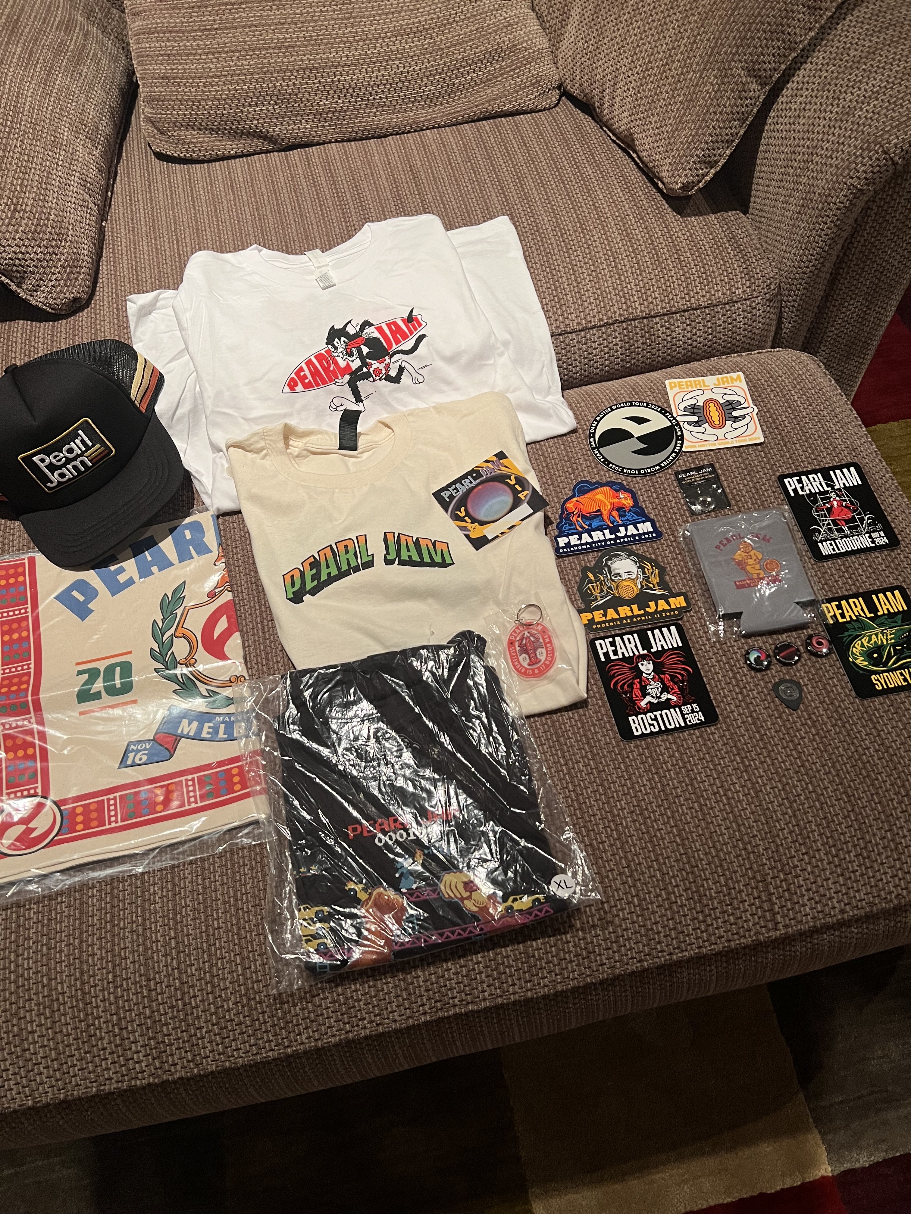 Men's medium - would be interested in trading for Portland/Seattle/Wrigley/Baltimore 2024 tour items. Token is Napa. Pins are Indy and LA. Keeping Bball and Lightning Bolt shirt.