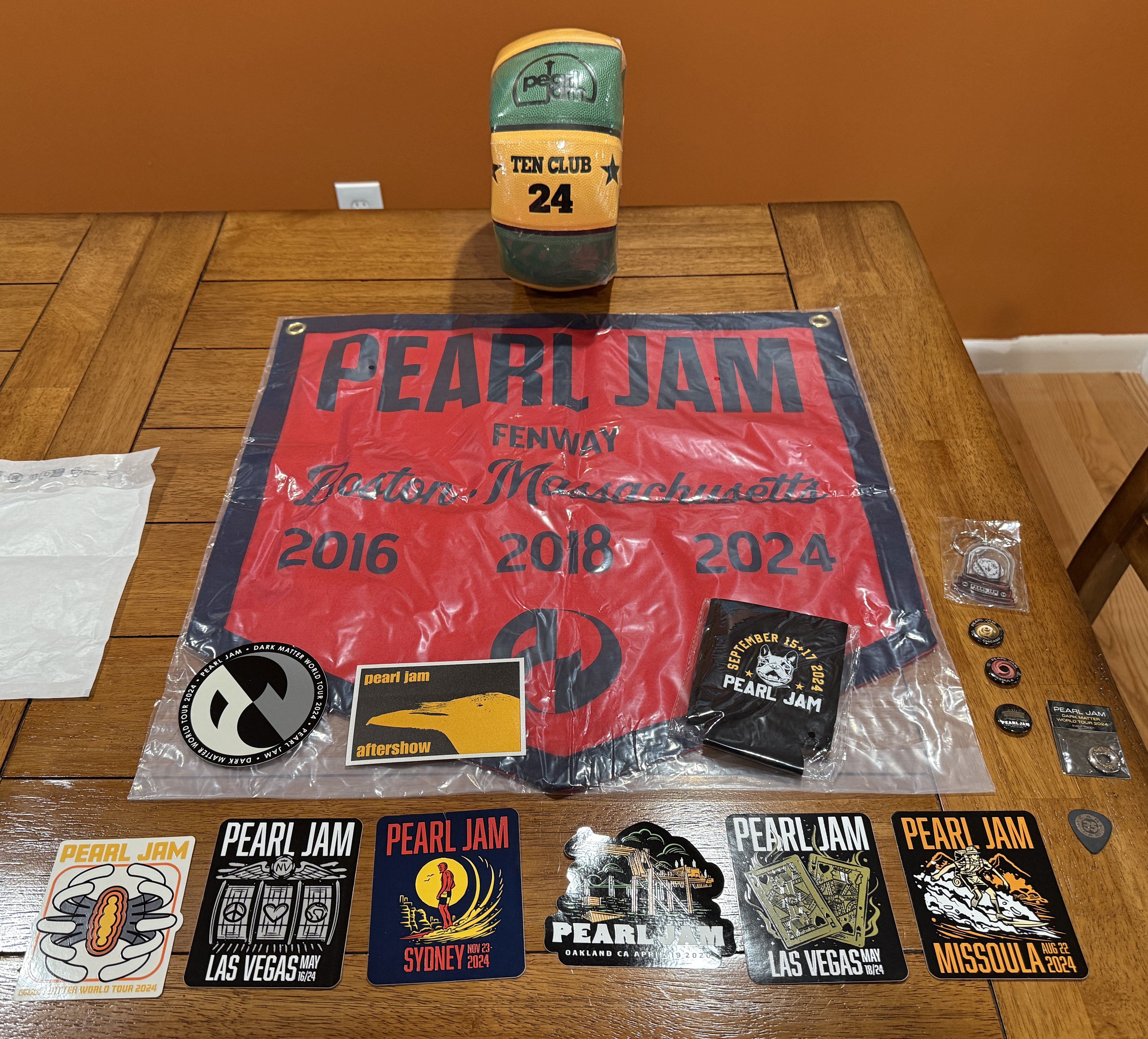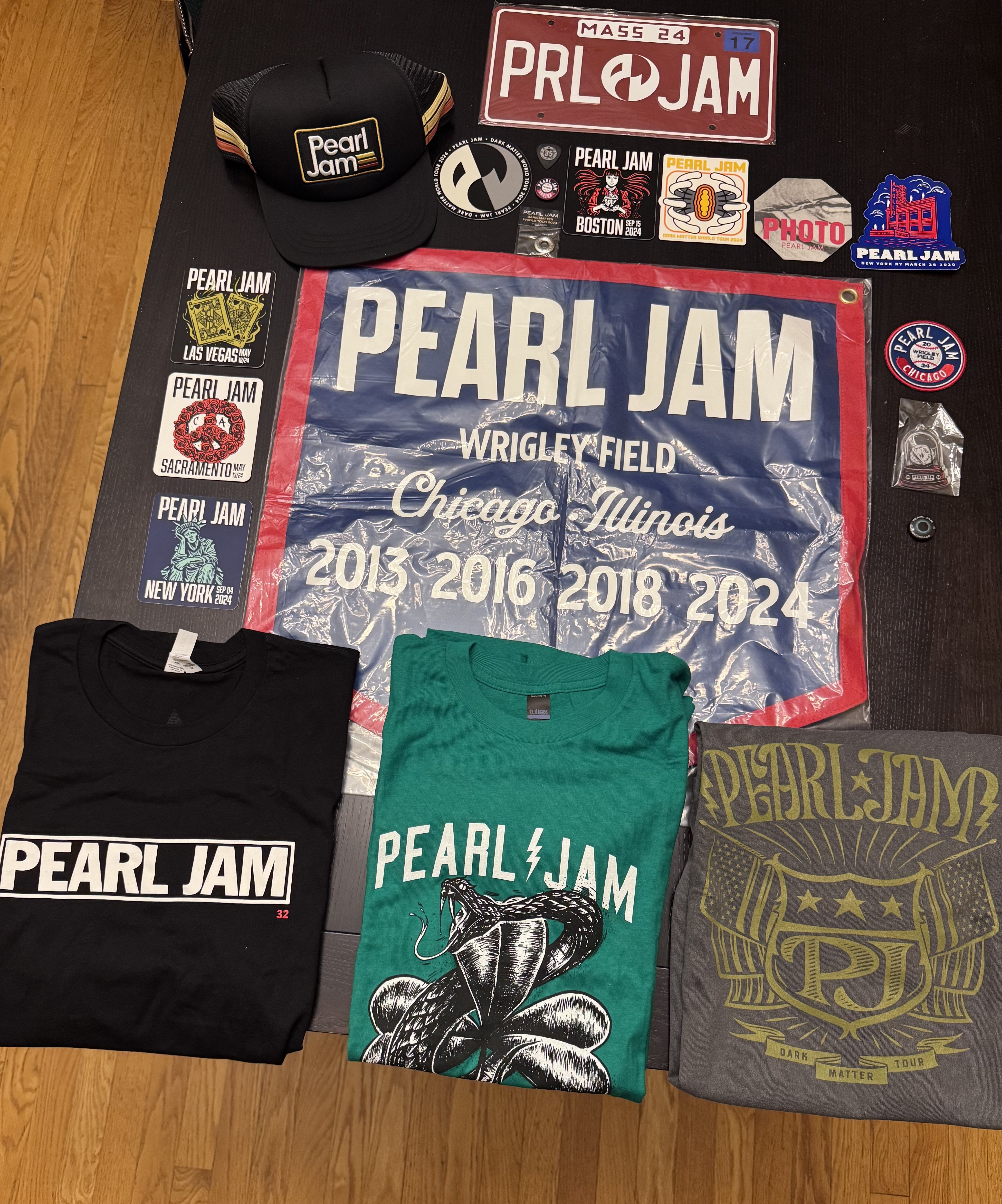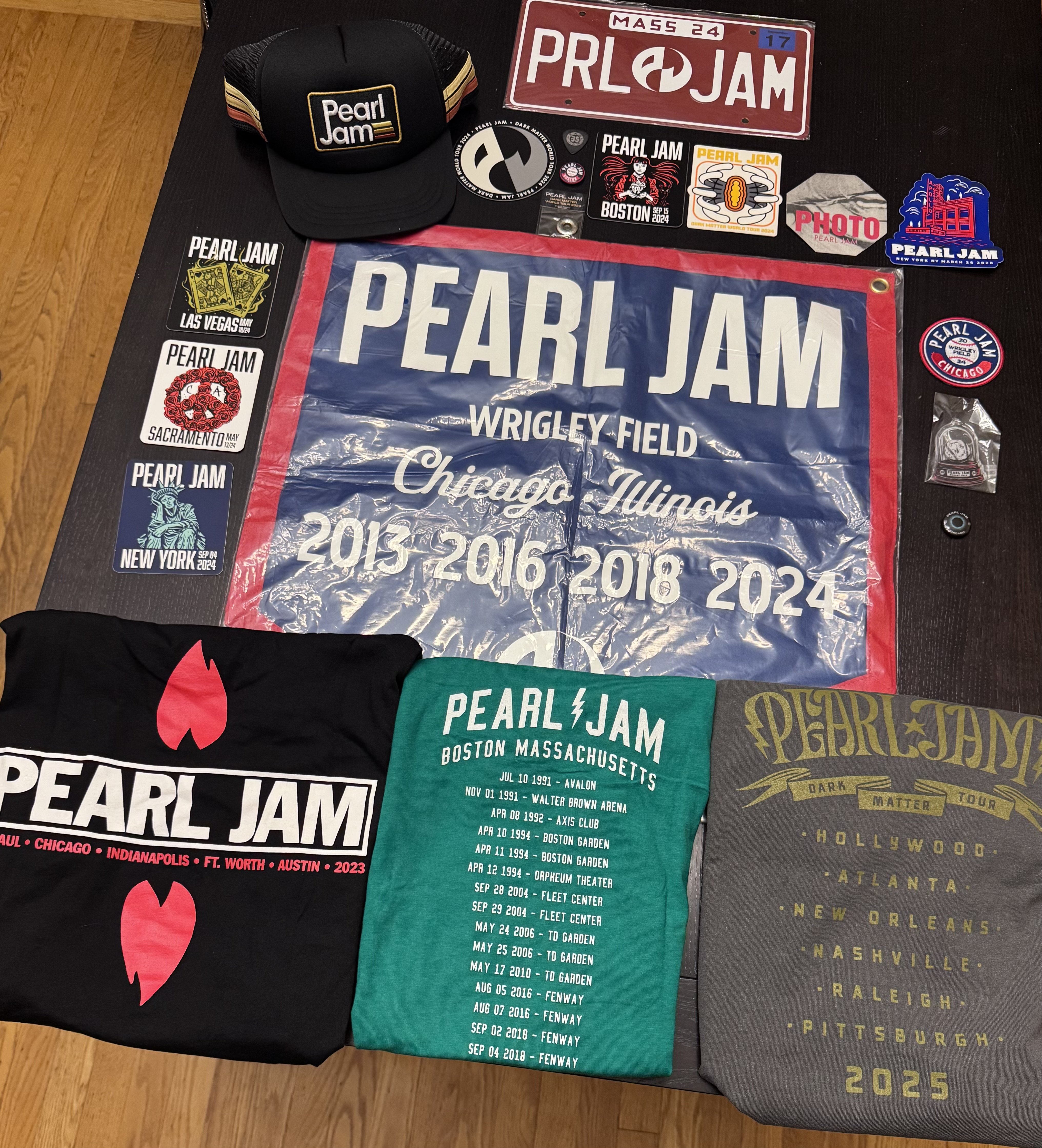 Have to admit it felt like Christmas came a little early today with the arrival of my Medium Mystery package. Thanks SLH! Did not expect the purple pick, so not disappointed. Love all of the Boston swag, though I have to admit the MA plate (white) I’ve seen in other posts looks like a more legit current plate than what I received. Anything Dark Matter I’m keeping, though the 2025 shirt with the 6 dates are not any of DM shows I attended.2024 Chicago Wrigley Field items (banner, patch, keychain, pin) reminded me how the one time I actually scored two (2) tickets in the 10C lottery to Wrigley, I had to sell at face value (the only way IMHO) to another fortunate fan due to a family obligation. Hopeful will get another opportunity down the road to see them play there after 3 Fenway shows. 😊I’d be happy to make a comparable exchange for swag to any other shows on my Ten Club profile. My only expectation was hoping for anything from the 4/29/26 Philly show, when they played all of Ten. That was the one show where I was completely shut out from the merch line.Front