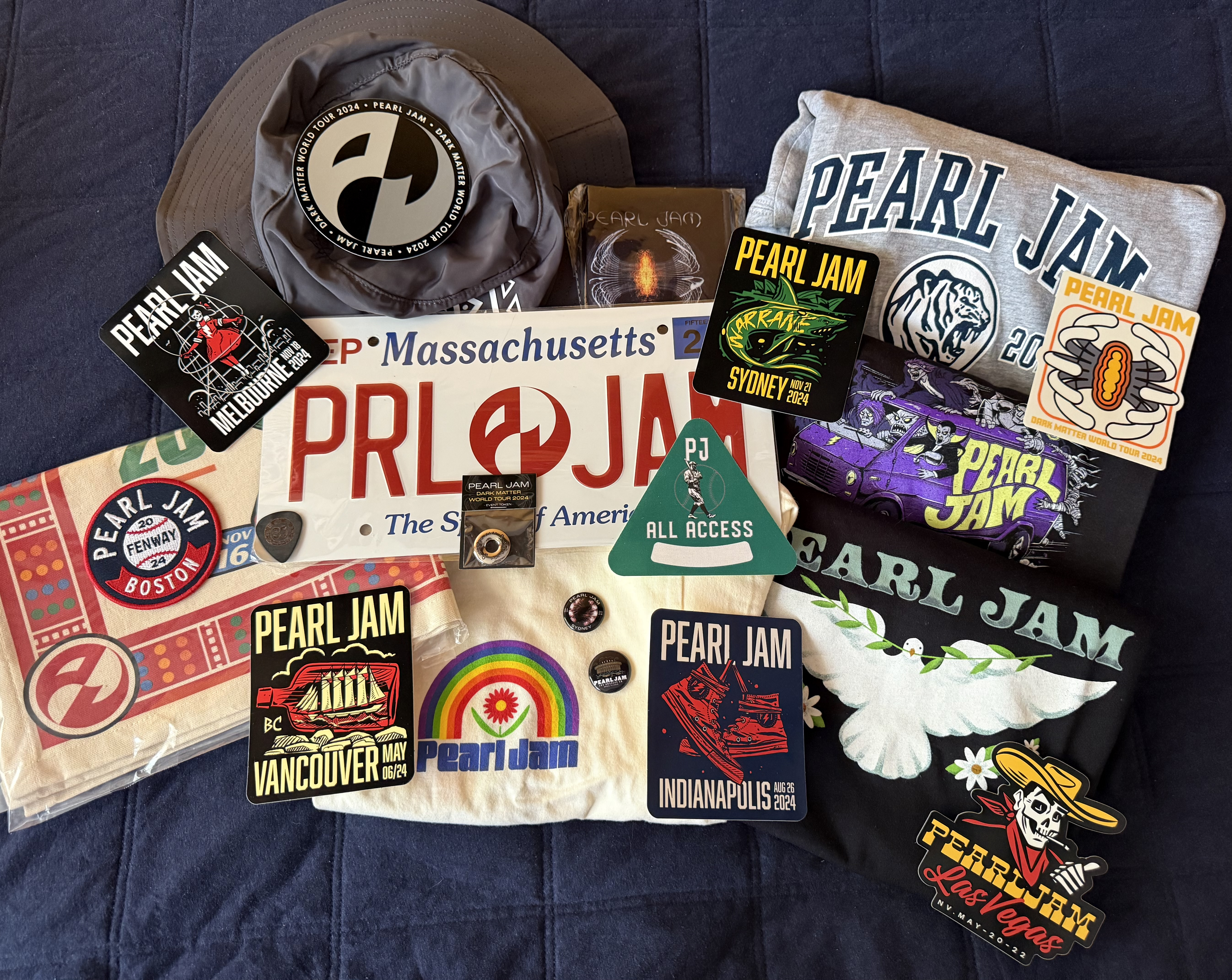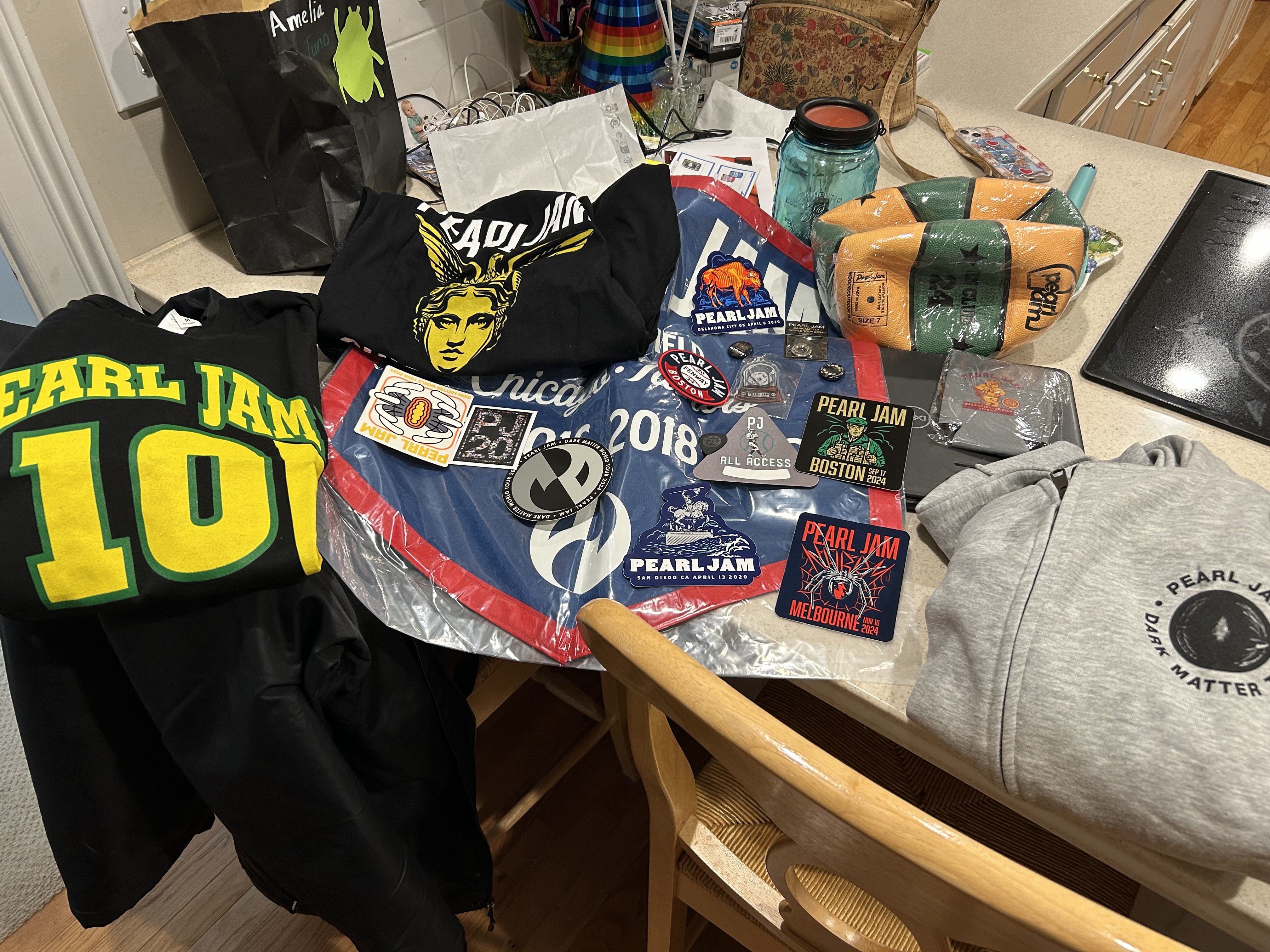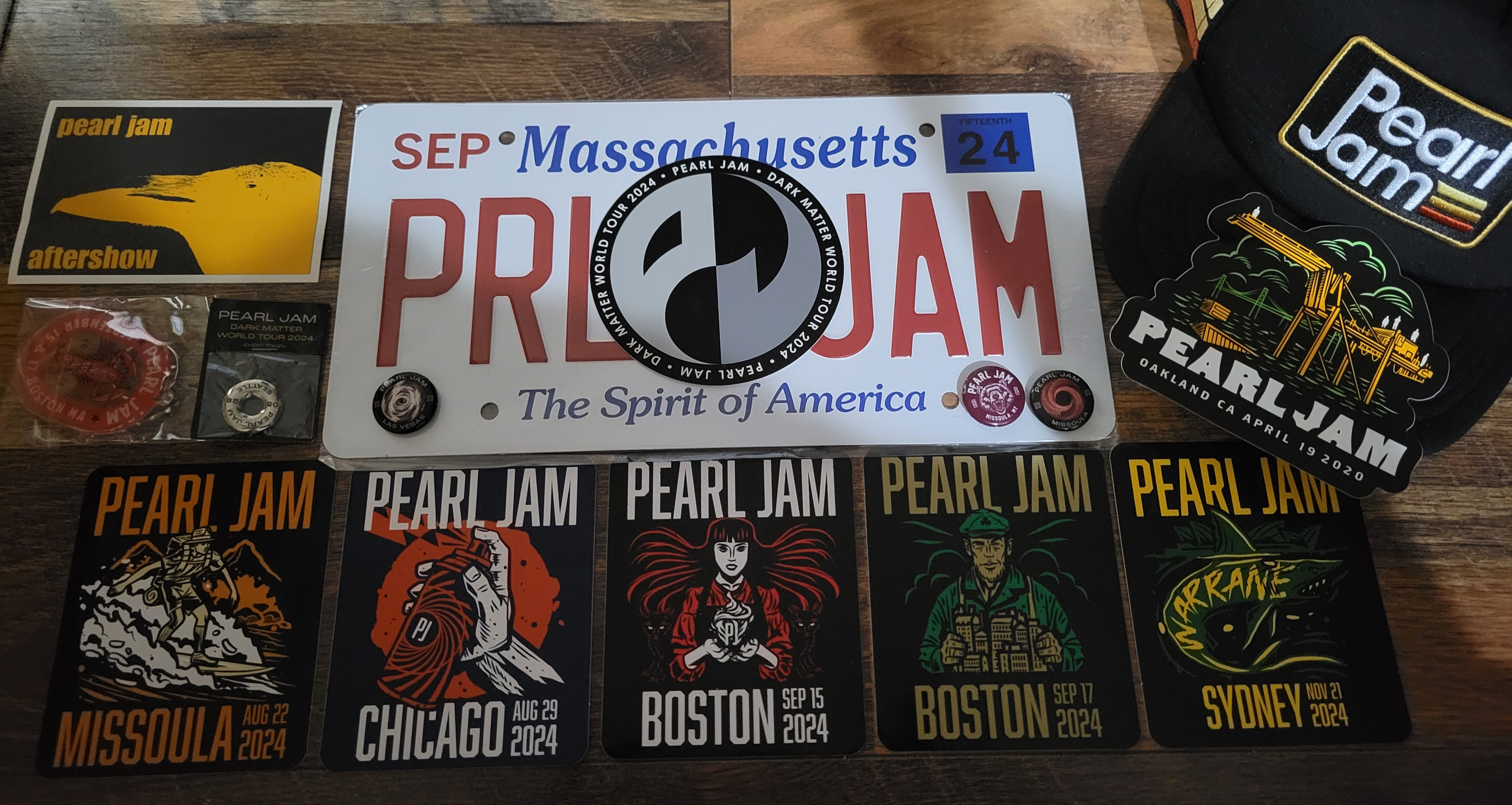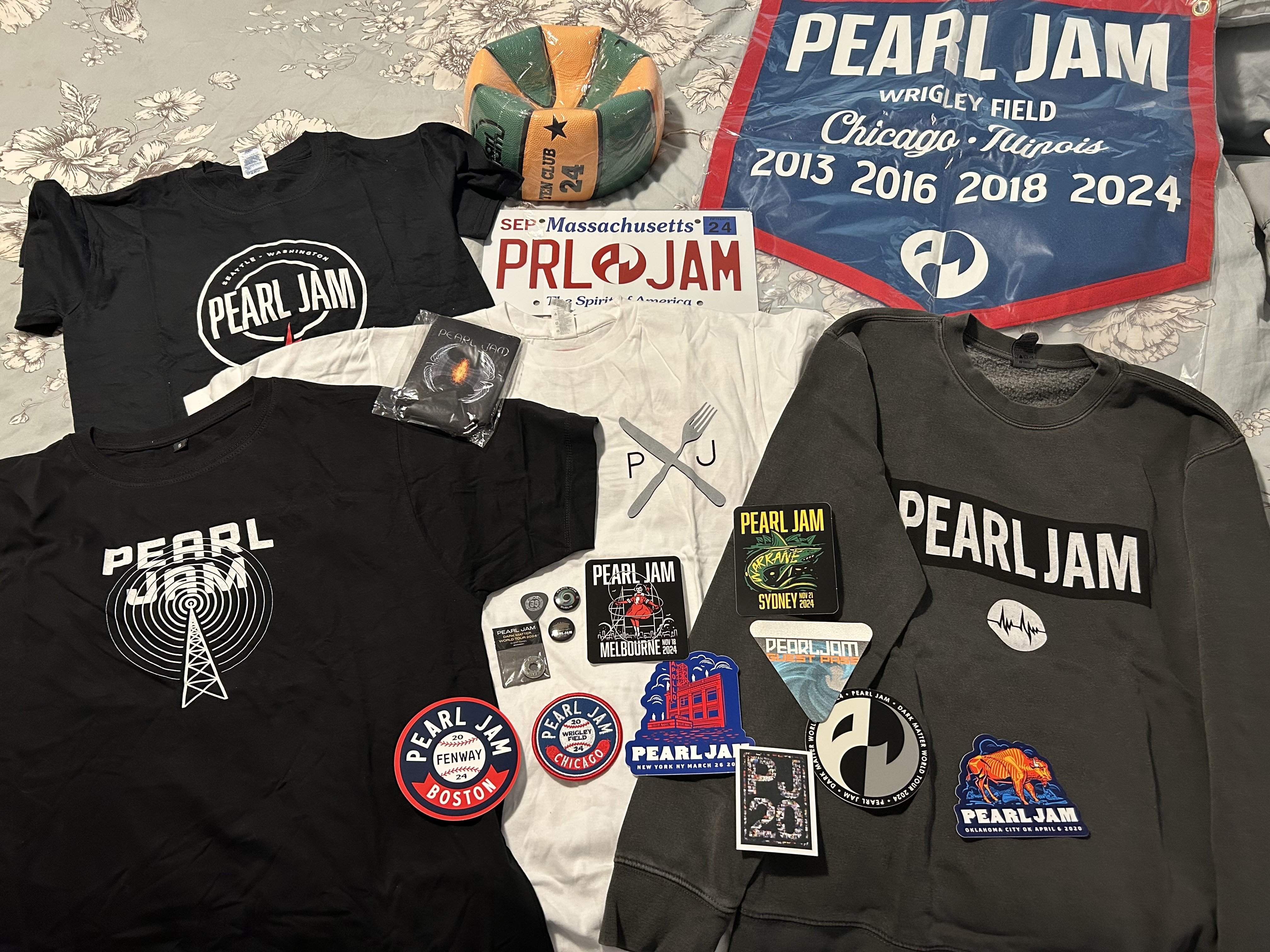 Have to admit it felt like Christmas came a little early today with the arrival of my Medium Mystery package. Thanks SLH! Did not expect the purple pick, so not disappointed. Love all of the Boston swag, though I have to admit the MA plate (white) I’ve seen in other posts looks like a more legit current plate than what I received. Anything Dark Matter I’m keeping, though the 2025 shirt with the 6 dates are not any of DM shows I attended.2024 Chicago Wrigley Field items (banner, patch, keychain, pin) reminded me how the one time I actually scored two (2) tickets in the 10C lottery to Wrigley, I had to sell at face value (the only way IMHO) to another fortunate fan due to a family obligation. Hopeful will get another opportunity down the road to see them play there after 3 Fenway shows. 😊I’d be happy to make a comparable exchange for swag to any other shows on my Ten Club profile. My only expectation was hoping for anything from the 4/29/26 Philly show, when they played all of Ten. That was the one show where I was completely shut out from the merch line.Front