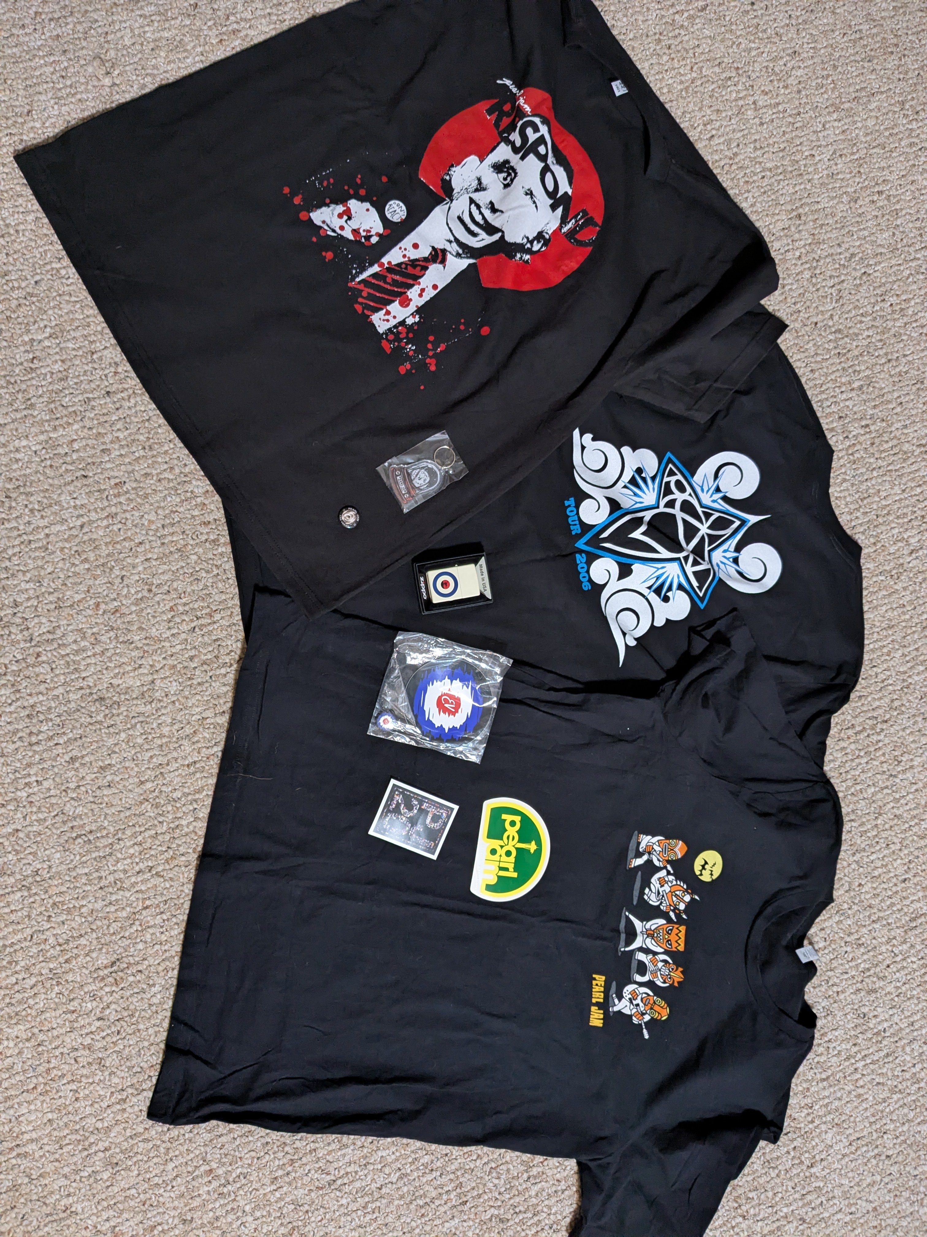 Medium just arrived! Went to the Fenway show so that stuff is cool. Never seen that strangest tribes shirt. Anyone know about it? VIP pass is neat, anyone know what tour? Guessing Binaural. I wasn’t at Missoula, so I don’t need the banner. Very cool bag! Will be trading or selling stickers and buttons. Sacramento and Vegas buttons. Los Angeles token. Shirts are probably just a tad small because I’m usually a Large so maybe unload those for Larges if possible.Post edited by Fullstack on0 -